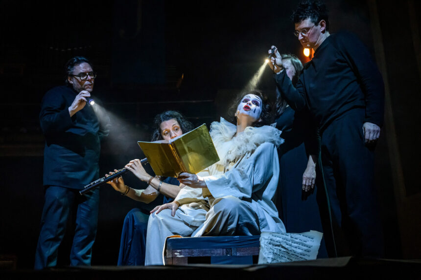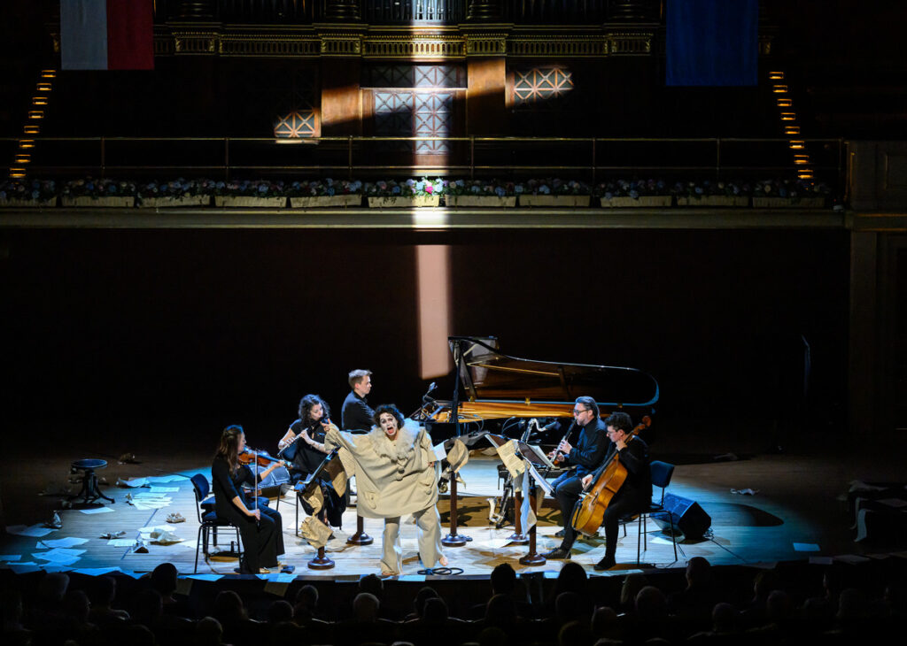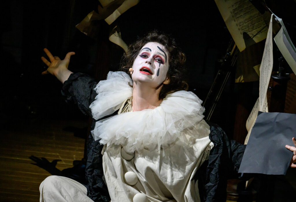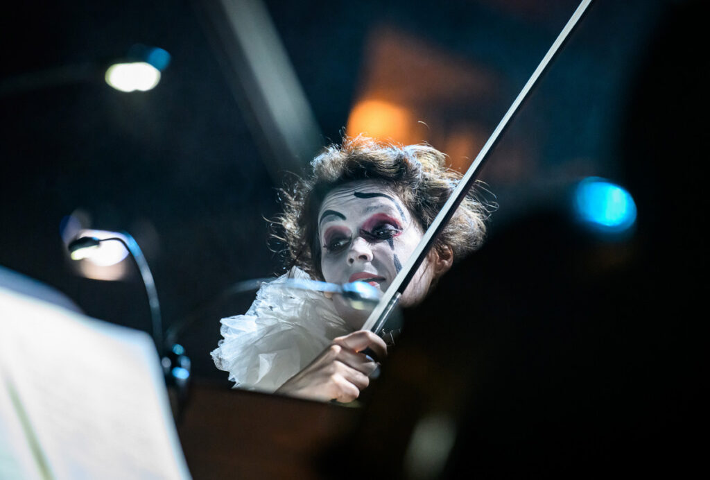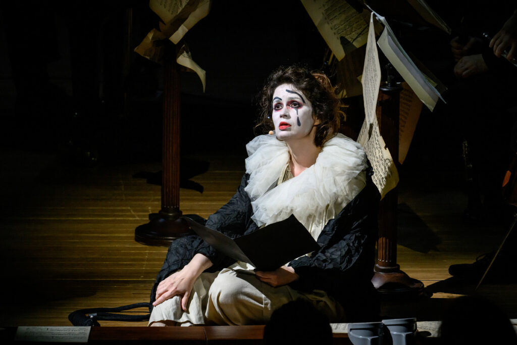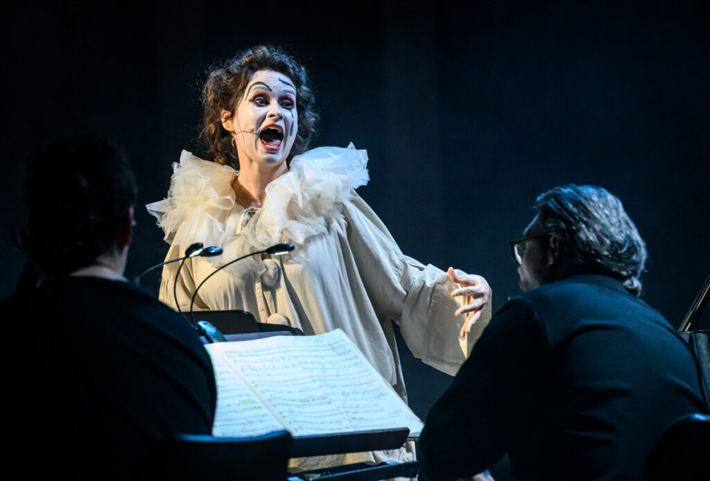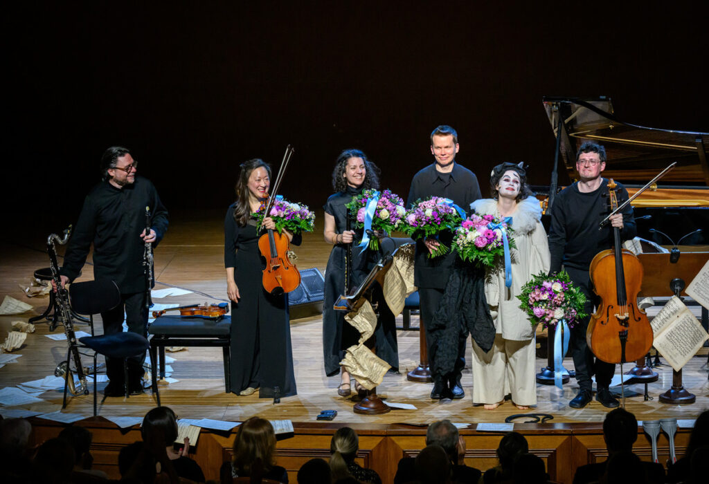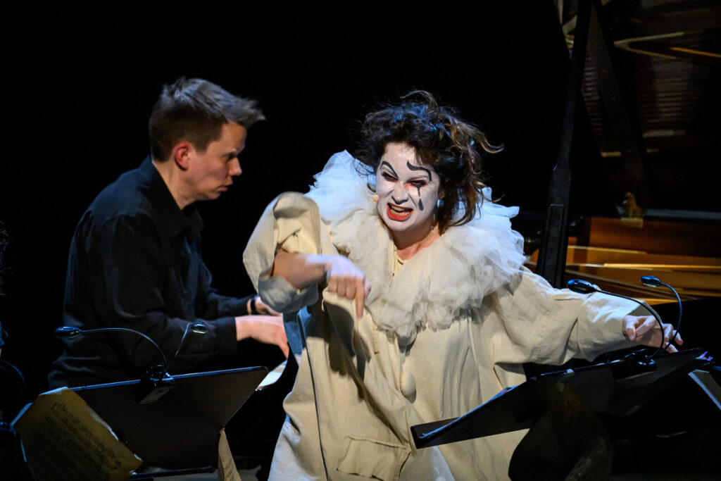 Pierrot lunaire, op. 21 „Třikrát sedm básní z díla Alberta Girauda ‚Pierrot lunaire‘“ – takový je celý název volně atonálního cyklu Arnolda Schönberga (daného večera paradoxně nejdříve narozeného komponisty), jehož název bývá do češtiny překládán jako Náměsíčný pierot či Měsíční pierot. A Pierrot lunaire byl i název celého pražskojarního programu v Rudolfinu, který v druhé polovině večera našel své těžiště, kdy k trojici předchozích muzikantů se přidali tři další Meesun Hong Coleman (housle), Júlia Gállego (flétna) a Thomas Kaufmann (violoncello). Ikonické, přelomové, symbolistní dílo nemá lineární příběh, jde spíš o vnitřní drama, sled snových obrazů, kde se pierot, archetyp smutného klauna, mění z tragikomické postavičky v zrcadlo lidské duše – rozervané, směšné i zoufalé. Skladatel si od recitátora přál zvláštní typ deklamace, který nazval Sprechgesang – nemá jít o zpívaný tón, nýbrž „melodii s pečlivým zřetelem k tónovým výškám“. Interpret nemá upadnout do zpěvavé mluvy, autor požadoval, aby si byl přesně vědom rozdílu mezi zpívaným a mluveným tónem. Rozdíl definoval tak, že zpívaný tón zachovává tónovou výšku beze změny; mluvní tón ji sice udá, hned ji však zase opouští v klesání nebo stoupání… je zřejmé, že pro hlavní interpretku dílo představuje nelehký, nestandardní úkol. Navíc, málokdy se s hudebním opusem pojí termín „expresionismus“, tady však tane na mysl.