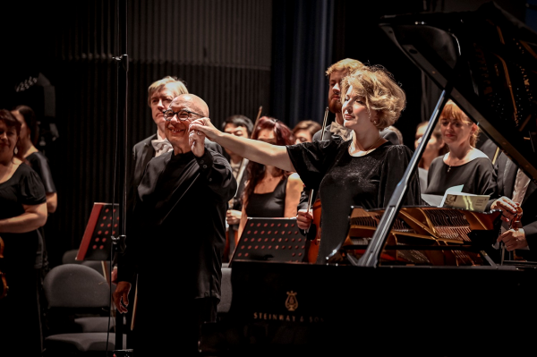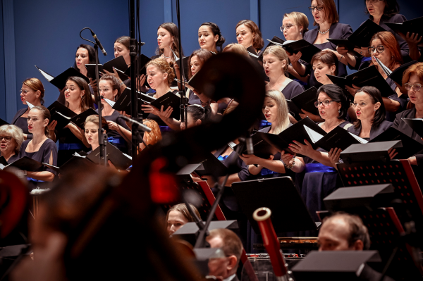 U fantazií ještě chvíli pobudeme. Dalším opomíjeným dílem je totiž Fantazie c moll pro klavír, sbor a orchestr L. van Beethovena, která je však vzhledem ke kontextu skladatelovy tvorby unikátní právě svojí volnou formou, jež se vyznačuje střídáním klavíru s orchestrem a instrumentalisty se sborem. Za klavír usedla ruská umělkyně Polina Osetinskaja známá téměř celému světu díky bohaté koncertní činnosti. Již v úvodní sólové introdukci stihla prostřídat několik typů úhozů a tím pádem také dynamické škály. Začala z plných sil a poté bez problémů přešla k velmi jemnému stylu hry. Skladba vykrystalizovala až do velmi líbivých melodií ve spojení s orchestrem připomínajících klavírní koncert. Úseky, v nichž klavír doprovázely různé sólové nástroje nebo smyčcový kvartet, zcela nenarušeny vyplynuly z původní plné orchestrální hry a vše působilo maximálně kompaktně. Evidentní bylo, že si muzikanti i dirigent vychutnávali část evokující snad až rachmaninovský adagiovitý styl. Šťavnaté tahy smyčci vystřídaly dechy tiše vplynoucí do lehkého trylku klavíru za maximálního vnímání emotivní harmonie. Konečně přišel na řadu také Slovenský filharmonický sbor pod vedením Jana Rozehnala, rovněž oceňované umělecké těleso s mezinárodní zkušeností. Sbor zpíval se soustředěností na korektní německou výslovnost. To mu však nebránilo využít i potenciál barevného splynutí hlasů jednotlivých skupin, jak se pak ukázalo zejména v následující skladbě. Sólově navíc vystoupilo šest pěvců – Zuzana Weiserová, Katarína Ďurdinová (soprán), Dominika Krčištová (alt), Pavol Oravec, Mykola Erdyk (tenor) a Eugen Gaál (bas), kteří si vedli bezproblémově. Pouze, dle mého vkusu, sopránové sólové party mohly být přiděleny spíše pěvkyním se silnějším hlasovým fondem, aby se vyrovnaly zvukové poměry mezi orchestrem, hutným sborem a klavírem. Zvolené dámy měly hlasy totiž jemnější a v tomto velkém uskupení tedy působily méně výrazně. Posluchači mohli v druhé polovině skladby mimo jiné zaznamenat náznaky oné slavné Ódy na radost, jež zazněly hned několikrát.