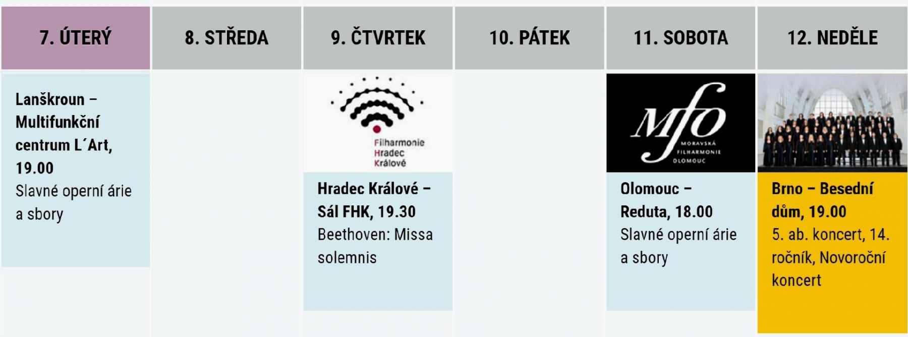 O víkendu pak Český filharmonický sbor Brno zopakuje úterní program se stejnými sólisty na Moravě, tentokrát za doprovodu orchestru. Moravskou filharmonii Olomouc bude na novoročním koncertě v olomoucké Redutě řídit dirigent Tomáš Hanák. K áriím a sborům přidá orchestr předehru ke Smetanově opeře Hubička, předehru k Bizetově Carmen a předehru k 3. dějství Lohengrina Richarda Wagnera. Začátek koncertu je naplánován na sobotu 11. ledna mimořádně na šestou hodinu. Vrcholem série bude v neděli 12. ledna novoroční koncert v rámci cyklu abonentních koncertů ČFSB v Brně. V Besedním domě zopakují účinkující naposledy operní program od sedmi hodin.