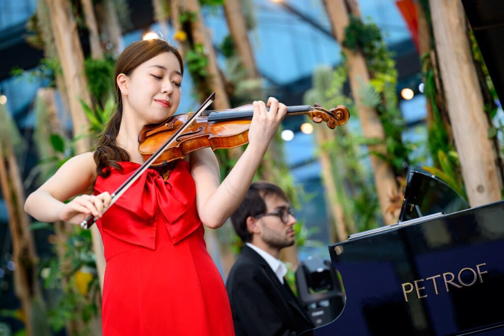 První polovina podvečerního programu, ještě před ne zcela běžným violoncellovým ansámblem, patřila klasickému duu, respektive především mladičké jihokorejské houslistce. Jmenuje se Boha Moon a studovala nejen v Americe, ale také v Praze u Josefa Špačka. I ona patřila letos k Ševčíkově akademii. Se studentem AMU Pavlem Praženicou u klavíru zahrála pěkně znějícím a obsažným tónem i s náležitým romanticky rozpřaženým a evidentně pevně zažitým výrazem Griegovu Druhou houslovou sonátu. Otakaru Ševčíkovi vzdali hold jeho známou úpravou lidové písně Holka modrooká, vršící všemožné technické efekty, ale i tak zdařile stále zanechávající v paměti melodii. V tomto případě se díky krkolomnosti svých partů oba přiblížili k hranici svých možností.