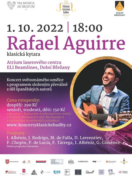Na dolnobřežanském Setkávání s klasickou hudbou vystoupí mezinárodně uznávaný španělský kytarista Rafael Aguirre. V Atriu laserového centra ELI Beamlines v sobotu 1. října od 18 hodin zahraje skladby Albénize, Rodriga, Fally, Lavrentieva, Chopina, de Lucíi, Tárregy či Giméneze.