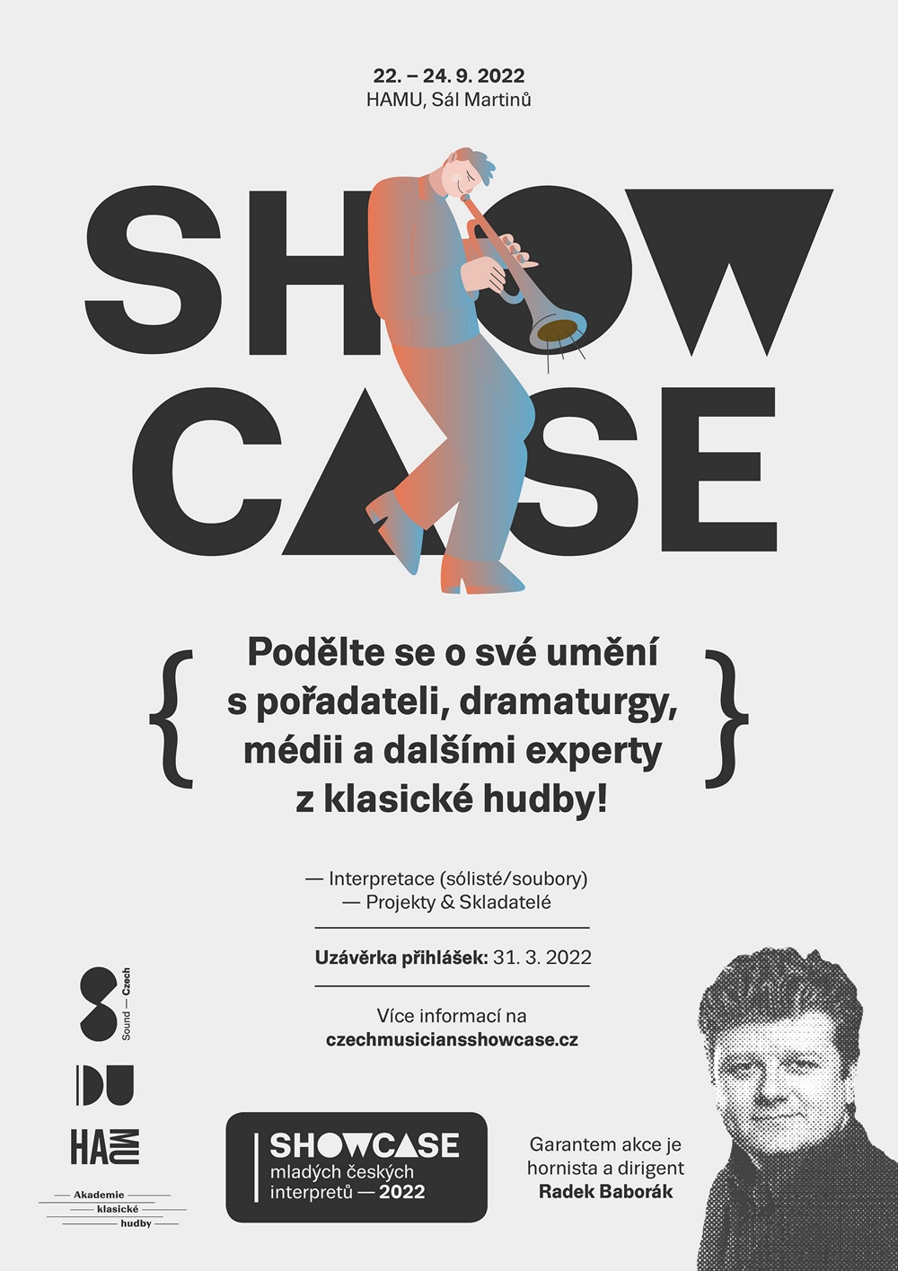 „Showcase je určený studentům konzervatoří, hudebních gymnázií, vysokých škol, ale také nadějným žákům ZUŠ, participantům vzdělávacích akademií nebo mistrovských kurzů,“ přibližuje hornista a dirigent Radek Baborák, který se SoundCzech celou akci zaštiťuje. „Není to soutěž. Chceme dát šanci začínajícím hudebníkům, aby ve Dvořákově sále Rudolfina, v Martinů sále HAMU nebo v Galerii HAMU předvedli to nejlepší a nejzajímavější z jejich repertoáru,“ vysvětluje Baborák. Vybraní hudebníci budou mít možnost vystupovat jako sólisté na večerním koncertu s orchestrem České sinfonietty. Mezi odměnami pro vybrané talenty budou ale také semináře, finanční podpora na mistrovské kurzy, nahrávací sekvence a další.