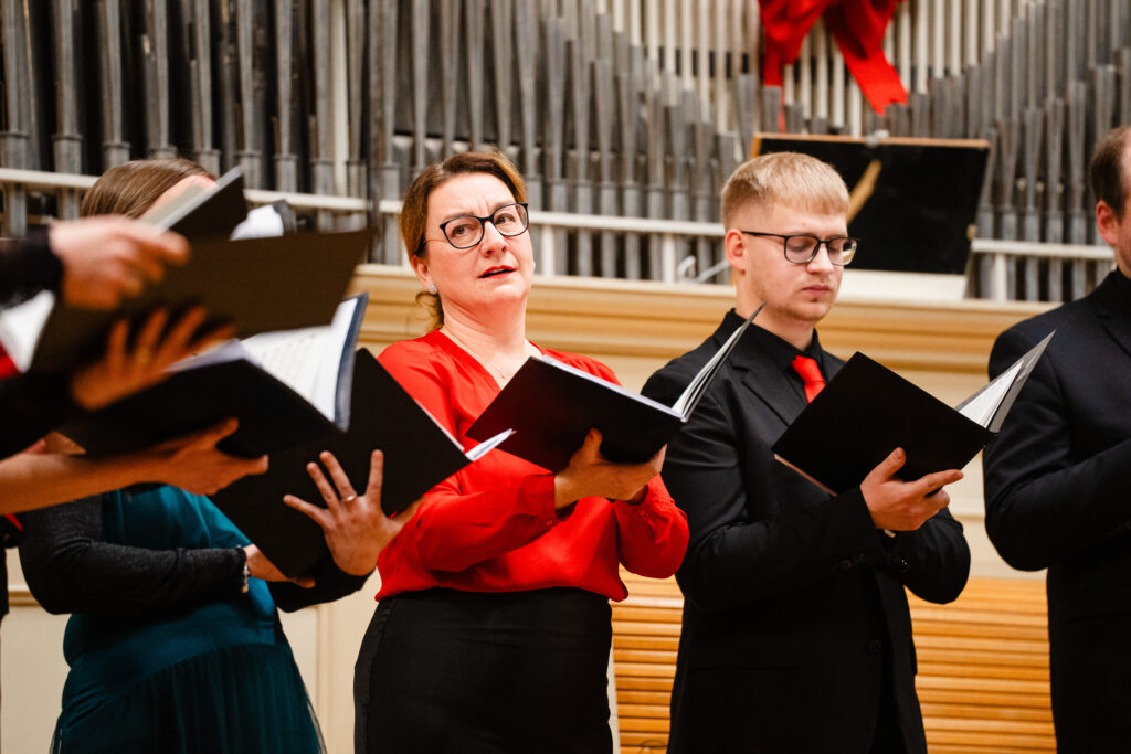 Z pohledu dramaturgie se stal skvost brněnského Besedního domu skvělým místem a soubor ho dokázal promyšleným aranžmá beze zbytku využít. Na počátku prostor potemněl a k osvětlenému varhannímu pozitivu na jevišti vstoupil za potlesku diváků varhaník Ondřej Múčka – jeho předehry, mezihry a improvizace spojovaly a provázely koledy celou první částí večera. Pak se z výšin galerie rozezněla první adventní píseň podle francouzské melodie z 15. století aranžovaná D. Willcocksem. O come, O come, Emmanuel. Zpívá se v předvečer vánočních svátků mnoha jazyky po celém světě. „Ach přijď, přijď, Emanueli, a osvoboď svůj zajatý Izrael, který zde naříká v osamělém vyhnanství, dokud se neobjeví Syn Boží…“ Ženský sbor s mužským se střídal i spojoval do unisona a v mezihře prošel kolem posluchačů až na pódium. Sólovým sopránem, ve staré Anglii tradičně chlapeckým, i jasně červenými šaty, zazářila Františka Nevrlá. V písni Once in Royal David‘s City na text irské básnířky Cecil Frances Alexanderové a nápěv Henryho Johna Gauntletta se pódiem rozestoupil a rozezněl šestnáctičlenný sbor společně s uměleckou vedoucí Terezou Válkovou. Mistrně nahradil tradiční chlapecký sbor Královské koleje univerzity v Cambridgi s malým chlapcem, který se o svém sólu dozvídal vždy těsně před vystoupením. Následující koledu O come, All Ye Faithful mnozí známe v latinském originále jako Adeste fideles. Text je připisován básníku Johnu Francisi Wadeovi a společně s ním prošla nelehkým osudem. Zde zazpívala skvělé sólo i Tereza Válková. Nebylo možné si nevšimnout také krásného hlubokého basu Martina Šujana, sólisty uvnitř sboru. Následovala koleda God Rest Ye Marry Gentlemen. Je známá z povídky Charlese Dickense. Vyniklo v ní sólo altisty Martina Ptáčka, též upravovatele textů a strážce čistoty historické angličtiny. Působivý byl i dvojhlas mužského sboru. Koleda Hark! The Herald Angels Sing s textem metodistického kněze Charlese Wesleyho zněla s působivou dynamikou až do vycizelovaných pianissim. Původem sahá k Felixi Mendelssohnovi-Bartholdymu a jeho Gutenbergově kantátě oslavující vynálezce knihtisku. Z ní melodii převzal a upravil mladý Mendelssohnův sborista. V nejstarší z uváděných koled, Coventry Carol, se zaskvěly vysoké, lahodně a dobře sladěné soprány. Na ně přímo navazovala skutečně radostná koleda první části večera Joy To The World s dokonalou dynamikou sboru a se sopránovým duetem Františky Nevrlé a Lenky Cafourkové Ďuricové. Dvojice dam v róbě červené a černé tak důstojně uzavřela první část koncertu.