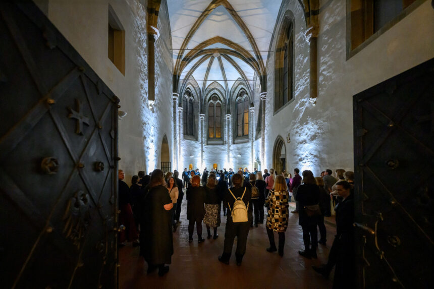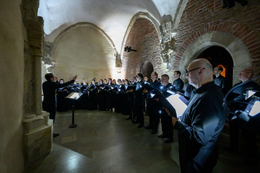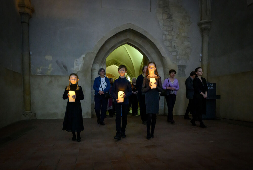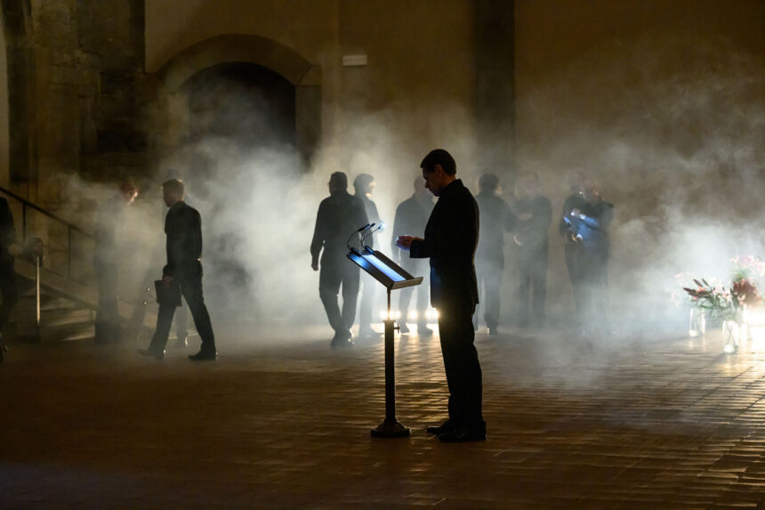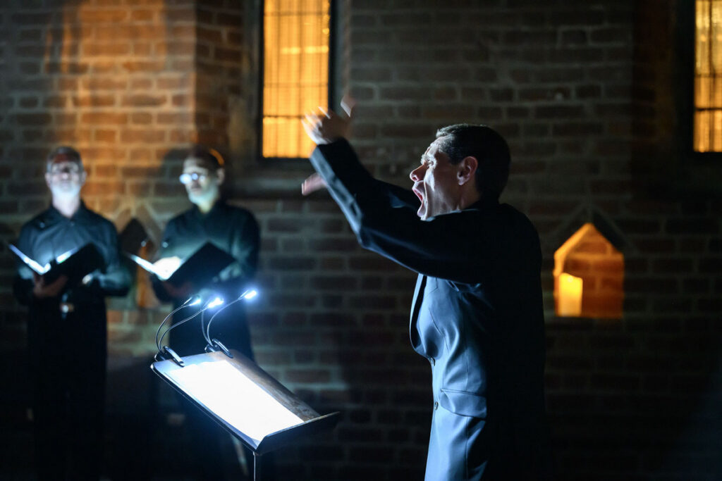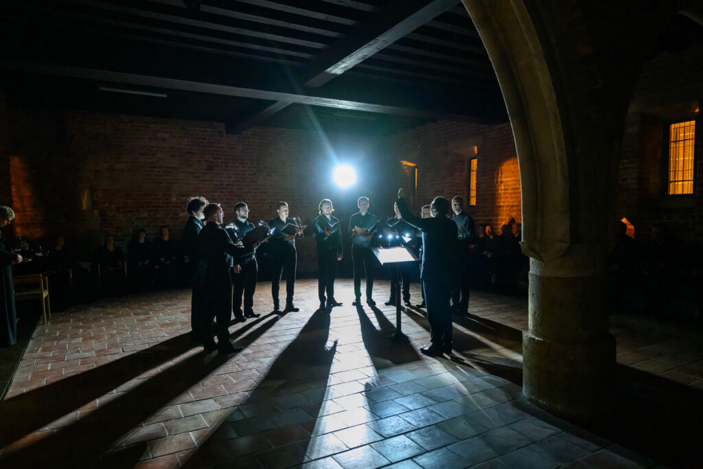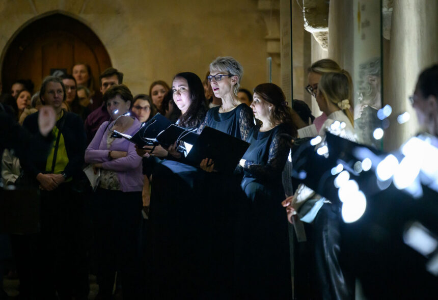 V půl deváté bylo tedy cca padesát diváků vpuštěno do křížové chodby, kde už začal znít žalm Miserere mei Deus současného skladatele Jiřího Churáčka. Zřetelně odkazuje na slavné dílo Gregoria Allegriho, vedle smíšeného sboru je zde i oddělený part tří ženských sólových hlasů. Ty ale Lukáš Kozubík umístil asi pět metrů od velkého sboru, aby je mohl také dirigovat. Přitom kdyby stály v protějším rohu čtvercové chodby, stranou všech očí, zažili by diváci hned na úvod právě ten zážitek, který imerzivní inscenace slibuje. Oba sbory zpívají antifonálně, odpovídají si, takže jejich společná souhra není třeba, proto jsem toto řešení považoval už na počátku za první promarněnou šanci. Následovalo přesouvání sboru po různých částech kláštera, které bylo provázeno hlasem recitátora textů – ať už právě doznělých skladeb, nebo textů dotvářejících jakési postní rozjímání. Bohužel hlas staršího muže, který byl pro tuto roli vybrán, neměl znělost a šíři ani příjemnost, takže jeho slova v akusticky náročnějších prostorách zanikala a jeho projev spíše dráždil, než aby lahodil divákovu uchu. Výběr recitátora, jakkoli charismatického, považuji za druhou promarněnou příležitost.