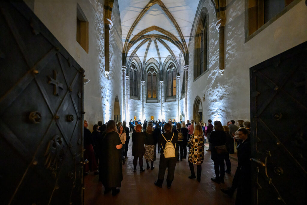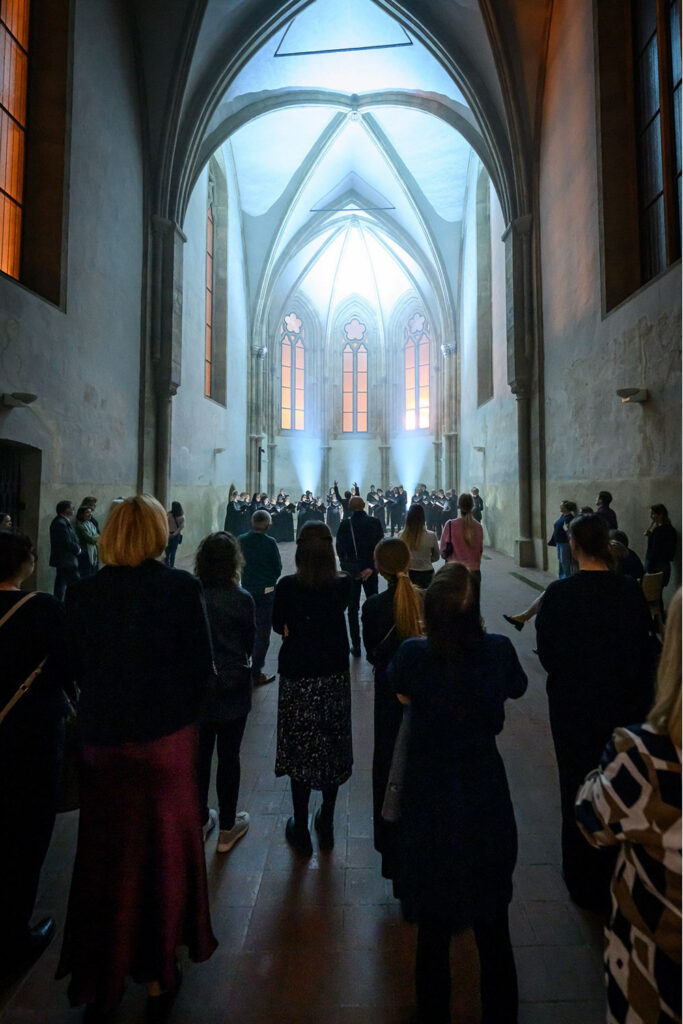 Zastavím se ještě chvíli u role diváka. Ten má imerzivní inscenaci dotvářet. Jedinou instrukci, kterou v onen večer dostal, byla malá čtvrtka papíru, na které stojí, že se může pohybovat libovolně ve vymezených prostorách, že je žádán o absolutní ticho, nedotýkání se předmětů či zpěváků a nepoužívání mobilů. Myslím, že v tomto ohledu byl na běžného diváka kladen příliš velký nárok. Zdálo se mi, že si diváci nebyli jisti, jak se mají chovat. Výsledkem bylo, že očekávaná klášterní meditace se proměnila spíše ve scénu velmi připomínající klasickou prohlídku pamětihodnosti. Dav se přesouval za průvodcem, tedy filharmonickým sborem, včetně klasického šoupání a klapání bot, včetně znuděných dětí a několika mobilních telefonů, které natáčely prostor a skladby navzdory přání autorů. Spolutvorba divákova spočívala tedy hlavně v tom, jak rychle se přesune, ostatně na některých skladbách byly i napsané instrukce, že počet slok se má určit podle pohybu publika. Možná by pomohlo pár slov na vysvětlenou v úvodu, ale Tomáš Pilař možná nechtěl zasahovat do svobodného rozhodování publika.