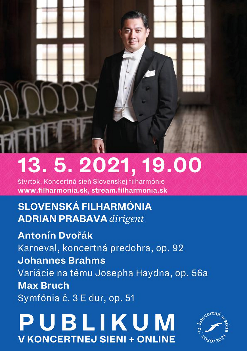 Dnes se v Koncertní síni Slovenské filharmonie uskuteční symfonický koncert, a to opět s publikem. První slovenský orchestr bude dirigovat německo-indonéský dirigent Adrian Prabava. Zaznějí díla Antonína Dvořáka, Johannesa Brahmse a Maxe Brucha. Začátek je v 19 hodin a přímý videopřenos bude tradičně k vidění na stream.filharmonia.sk.
