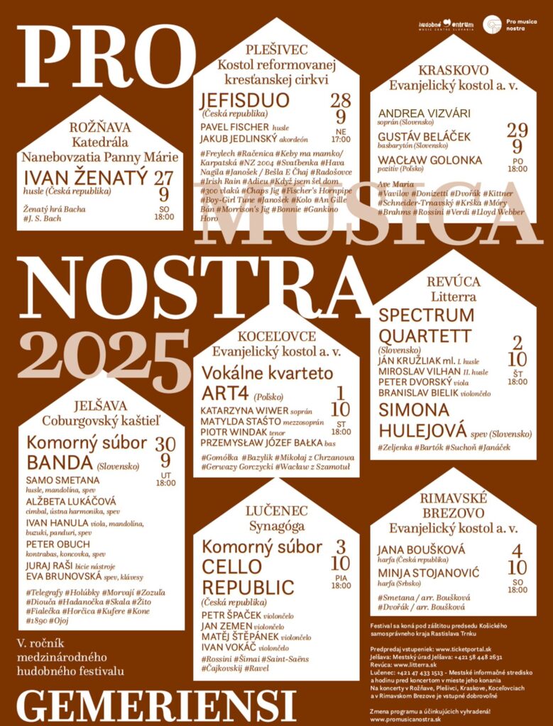 Souběžně konaný festival Pro Musica Nostra Gemeriensi rozezní historické památky v regionech Gemer, Novohrad a Malohont, koncerty se uskuteční v sakrálních památkách v Rožňavě, Plešivci, Kraskově, Jelšavě, Koceľovcích, Revúci, Lučenci a Rimavském Brezově. Akce nabídne program totožný s nitranskou odnoží. O zahájení se postará opět Ivan Ženatý, a to v sobotu 27. září v rožňavské katedrále Nanebevzetí Panny Marie. Následující den, 28. září, se v kostele reformované křesťanské církve v Plešivci představí akordeonista Jakub Jedlinský a houslista Pavel Fischer. Pondělní večer 29. září bude patřit mariánskému programu v interpretaci sopranistky Andrei Vizvári, basbarytonisty Gustáva Beláčka a varhaníka Wacława Golonky v kostele v Kraskově. V úterý 30. září ožijí nově zrekonstruované prostory renesančně-barokního sídla Coburgovců v Jelšavě vystoupením slovenského souboru Banda, dopolední program pro děti soubor zahraje ve Štítniku. Polské kvarteto Art4 vystoupí 1. října v Koceľovcích, o den později se v Revúci představí Spectrum Quartett se Simonou Hulejovou. Cello Republic zavítá 3. října také do Lučence a harfový závěr v podání Bouškové a Stojanović se na Gemersku uskuteční 4. října v evangelickém kostele v Rimavském Brezově.