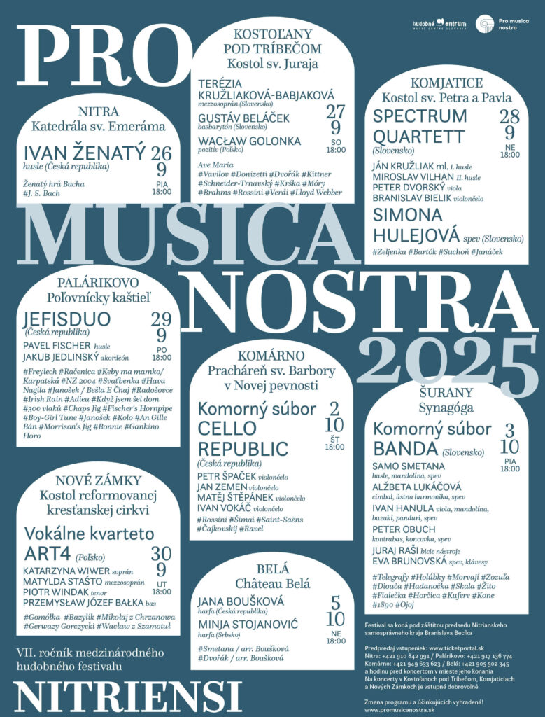 Sedmý ročník festivalu Pro Musica Nostra Nitriensi přinese na přelomu září a října do Nitrianského kraje sérii koncertů klasické hudby v historických prostorách. Hudba zazní v kostelech, zámcích a dalších památkách v Nitře, Kostoľanech pod Tríbečom, Komjaticích, Palárikovu, Nových Zámcích, Komárně, Šuranech a v Belé. O zahájení se v pátek 26. září v katedrále sv. Emeráma v Nitře postará český houslista Ivan Ženatý, který představí dvě díla Johanna Sebastiana Bacha pro sólové housle – Sonátu C dur a Partitu d moll. Následující večer zazní v kostele sv. Juraja v Kostoľanech duchovní skladby inspirované modlitbou k Panně Marii v podání mezzosopranistky Terézie Kružliakové, basbarytonisty Gustáva Beláčka a varhaníka Wacława Golonky. Nedělní koncert v Komjaticích je věnován tvorbě významného slovenského skladatele Eugena Suchoně, jehož hudba zazní spolu s díly Bartóka, Janáčka a Zeljenky v interpretaci souboru Spectrum Quartett a zpěvačky Simony Hulejové.