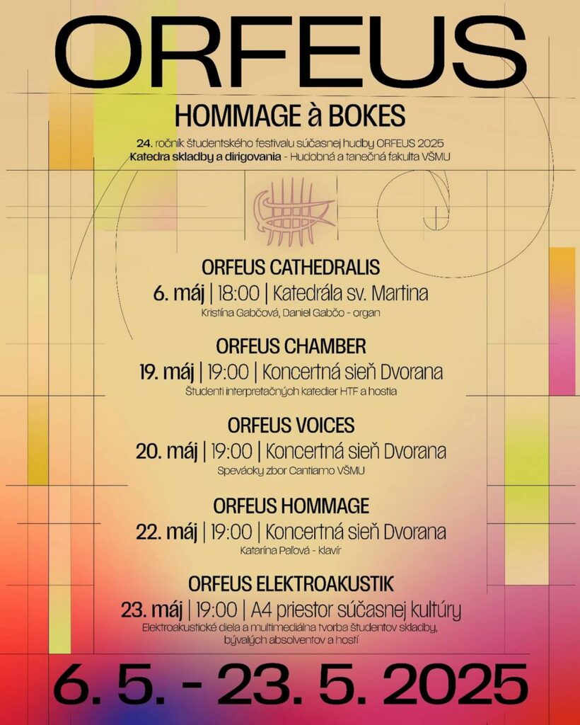Hudební přehlídka soudobé klasické hudby Orfeus, kterou počtyřiadvacáté pořádá Katedra skladby a dirigování Hudební a taneční fakulty bratislavské VŠMU pokračuje mezi 19. a 23. květnem čtyřmi koncerty, jejichž tematickým středobodem je pocta slovenskému komponistovi a pedagogovi Vladimíru Bokesovi.