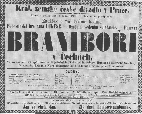 Byl to rok, ve kterém se doslova zrodila česká opera. Takový triumf vyvolala v Prozatímním divadle lednová premiéra Braniborů v Čechách. Maýr úkol odmítl, a tak ji nastudoval a dirigoval Smetana. A úspěch slavilo nejen jeho skladatelské umění, očividně výsledkem přesahující tehdejší domácí poměry, ale i umění interpretační, neméně vyspělé. Jedním z vrcholů Smetanovy organizační a dirigentské činnosti byla vedle toho na jaře 1866 pražská premiéra Lisztova oratoria Legenda o svaté Alžbětě.
