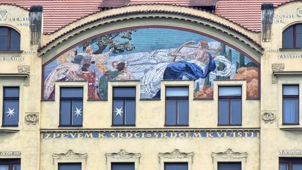 Nynější secesní budova Hlaholu na nábřeží proti Žofínu se začala stavět v roce 1903, první zkouška pod vlastní střechou se uskutečnila 18. září 1905. Oficiální slavnost otevření sálu, spojená s koncertní zábavou na Žofíně a s ranní mší v Týnském chrámu, se konala v listopadu. Interiér Velkého sálu doplnil roku 1921 Alfons Mucha svým posledním velkým dílem – lunetou Píseň.
