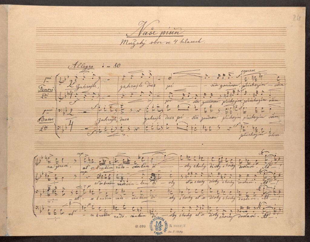 Poslední Smetanovou sborovou skladbou je Naše píseň dokončená 20. května 1883 a původně komponovaná pro znovuotevření Národního divadla.