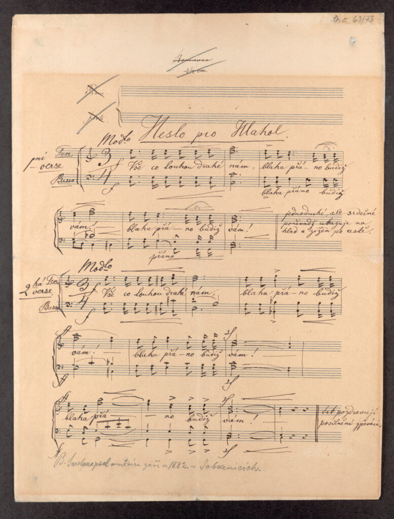 Vyprávění o Smetanově sborové tvorbě by nebylo kompletní bez Hesla pro Hlahol, které ve dvou odlišných verzích vytvořil v září roku 1882. Podnětem byla žádost Josefa Srba-Debrnova, který pro zájezdy a výlety pražského Hlaholu potřeboval pěvecké heslo či zdravici. Během své návštěvy v Jabkenicích Smetanovi donesl svůj krátký text, který skladatel následně – ač zcela pohlcen kompozicí svého druhého smyčcového kvartetu – zhudebnil, a to hned ve dvou variantách. Ke každé z nich navíc připsal vtipné poznámky; u prvního „Jednoduché, ale srdečné, poněvadž ukazuje na hlad a žízeň po cestě“, u druhého „Tak pozdravují posilnění zpěváci“.