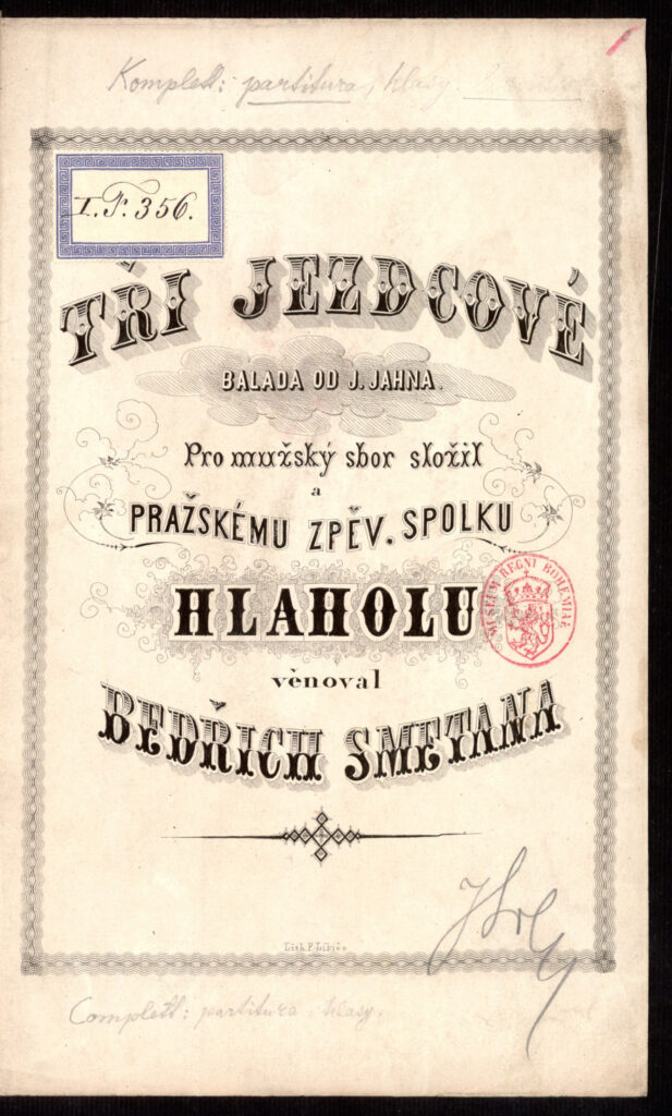 Další Smetanova sborová tvorba je pevně spjata se zpěváckým spolkem Hlahol založeným na počátku roku 1861, mezi jehož členy skladatel pronikl prostřednictvím přátelství s předsedou spolku knížetem Rudolfem Thurn-Taxisem. Ten pravidelně pořádal večírky, na něž byl Smetana zván, a měl tak možnost seznámit se s řadou osobností s Hlaholem spojených. V květnu roku 1862 se zúčastnil první slavnosti sjednocených zpěváckých spolků, kde jej výkon Hlaholu natolik oslovil, že se rozhodl pro něj komponovat. Mezi květnem a říjnem téhož roku tak vznikl sbor Tři jezdci na slova básně Jiljího Vratislava Jahna popisující návrat tří českých pánů z Kostnice do Čech se zprávou o upálení Mistra Jana Husa. Na svou dobu technicky extrémně náročné dílo, v jehož středním díle Smetana zajímavě pracuje s dramatickým projevem sólistů – tří jezdců – bývá označováno za jeho první zralou dokončenou kompozici po návratu ze Švédska, v níž navíc poprvé zpracovává téma husitské epochy. Jeho premiéra proběhla v únoru roku 1863 na Žofíně s velkým úspěchem.