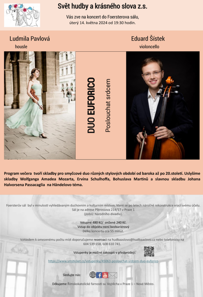 V úterý 14. května pražská Foersterova síň přivítá českou houslistku Ludmilu Pavlovou a violoncellistu Eduarda Šístka, kteří společně občasně vystupují jako Duo Euforico. Program večera tvoří skladby pro smyčcové duo různých stylových období od baroka až po 20. století. K poslechu budou skladby Wolfganga Amadea Mozarta, Ervína Schulhoffa, Bohuslava Martinů a oblíbená Passacaglia na Händelovo téma Johana Halvorsena. Koncert pořádá spolek Svět hudby a krásného slova.