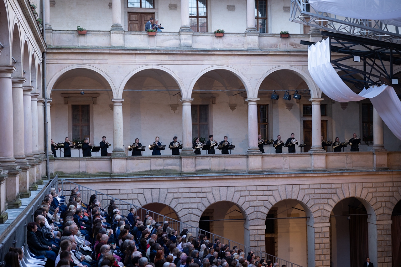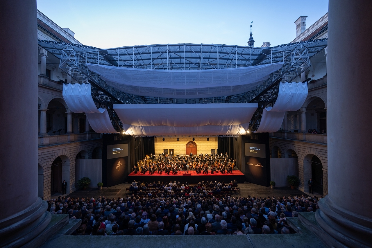 Alexander Liebreich s nadstandardně početně obsazeným orchestrem ztvárnil Alpskou symfonii bez přehnané snahy budovat velká zahloubaná mysteria. Vedl ji jako barvitou, emotivní a přístupnou skladbu, která neřeší existenciální pocity, ale přesto je dostatečně oduševnělá a dokáže se vznešeně pozastavit. Prostředí koncertní síně samo o sobě podporuje artistnější vyznění. Plenérový koncert v Litomyšli, s oblohou tmavnoucí soumrakem a s nedalekým podvečerním štěbetáním ptáků, dostal ještě pohodovější atmosféru, jistě ovšem i proto, že šlo o reprízu s větším komfortem ji ozkoušeného. Na začátku a na konci, v dlouhých „nočních“ akordech, si lze v obou případech představit ještě větší ztlumení hrajících nástrojů, na nádvoří pečlivější integrování nejhlubších žesťů do celkového zvuku, ale jinak byla celá symfonie krásně modelována, stavěna, proměňována a posunována a od členů orchestru i v exponovaných partiích zahrána ochotně. A že je v ní dost hraní, ať už v dlouhých a vydatných pasážích tutti smyčců, v sólech i tématech dřevěných nástrojů, nebo v žesťových vstupech, kterým často dominoval v nejvyšší poloze trumpetista Jiří Houdek.