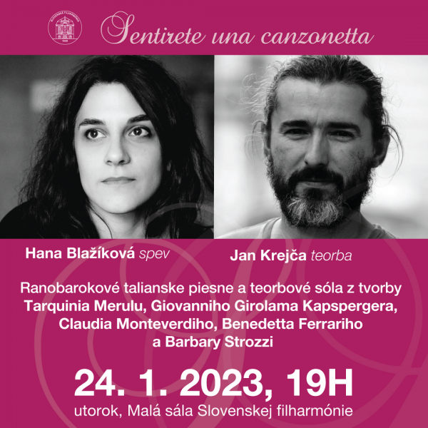 V úterý 24. ledna se bude v Malém sále Slovenské filharmonie od 19 hodin konat druhý koncert cyklu Stará hudba. Hosty večera budou sopranistka Hana Blažíková a theorbista Jan Krejča. Ti spolu představí díla Tarquinia Meruly, Giovanniho Girolama Kapsbergera, Claudia Monteverdiho, Benedetta Ferrariho a Barbary Strozzi.