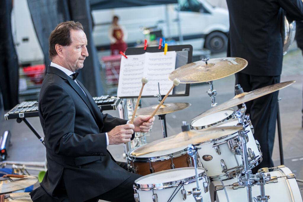 Deset hudebníků, jejichž nástroje stály v pozoru připravené na pódiu již dlouho před zahájením, doplňoval hráč na bicí. Většinou postarší pánové v černém se tvářili vážně a zpočátku to také vypadalo na koncert vážné hudby.