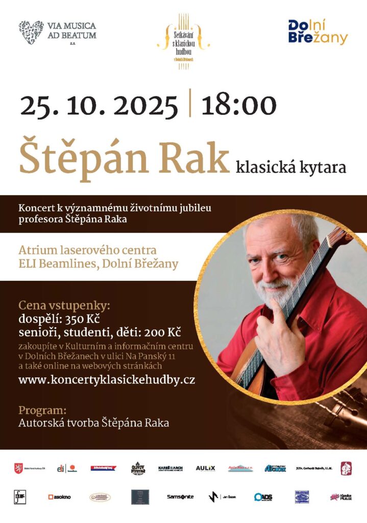Atrium laserového centra ELI Beamlines v Dolních Břežanech (Praha-západ) se dne 25. října rozezní témbrem kytary. Od osmnácti hodin totiž vystoupí legendární český kytarista a skladatel Štěpán Rak. Koncert je věnován významnému životnímu jubileu tohoto umělce. Na koncertě v rámci cyklu Setkávání s klasickou hudbou v Dolních Břežanech zazní výběr z Rakovy autorské tvorby.