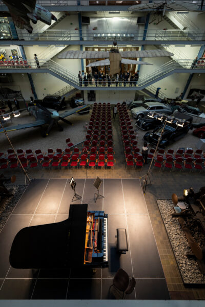 „Málokdy se naskytne takový pohled. Modely dvouplošníků, parní lokomotiva, historické automobily a do toho v témže zorném poli pódium s klavírem (trochu vtipně značky Yamaha).“