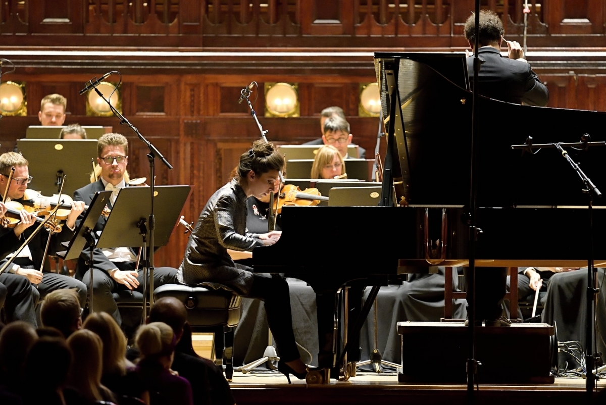 Jaká by to byla oslava polské hudby, kdyby chyběl Fryderyk Chopin. Jeho Koncert pro klavír a orchestr č. 1 e moll přišla zahrát Julianna Avdějeva, vítězka Chopinovy klavírní soutěže, není tedy divu, že si ji Poznaňští pozvali i k provedení Chopinova klavírního koncertu. I Juliannu jsme letos již slyšeli, dokonce v tom samém sále, na mimořádném koncertu FOKu, kdy doprovázela fenomenální německou houslistku Julii Fischer. Již v tehdy ukázala, že je skvělou klavíristkou. To potvrdila i v pátek večer. Chopin byl klavírní skladatel par excellence. Klavír byl pro něho vždy prvořadý, orchestr mu sloužil jenom jako doprovodný prvek. U Chopina v obou klavírních koncertech nejde o dialog mezi sólistou a orchestrem. Orchestr pouze podmalovává zvuk klavíru. V koncertu e moll oproti koncertu f moll se přece jen pokusil dát orchestru více místa, třeba v poměrně dlouhém orchestrálním úvodu i ve figurativních pasážích. Je to ale klavír, který na sebe strhává veškerou pozornost. Koncert je plný interpretačních těžkostí a klade na klavíristu mimořádné nároky. Pro Juliannu Avdějevu jako kdyby nebyly, vše se zdálo neuvěřitelně snadné. Její hra mi připomínala Valentinu Kameníkovou s její razancí i vervou. Přesto, zvláště ve střední části, byla krásně lyrická. Svým výkonem strhla i orchestr. Odměnou byl bouřlivý potlesk.