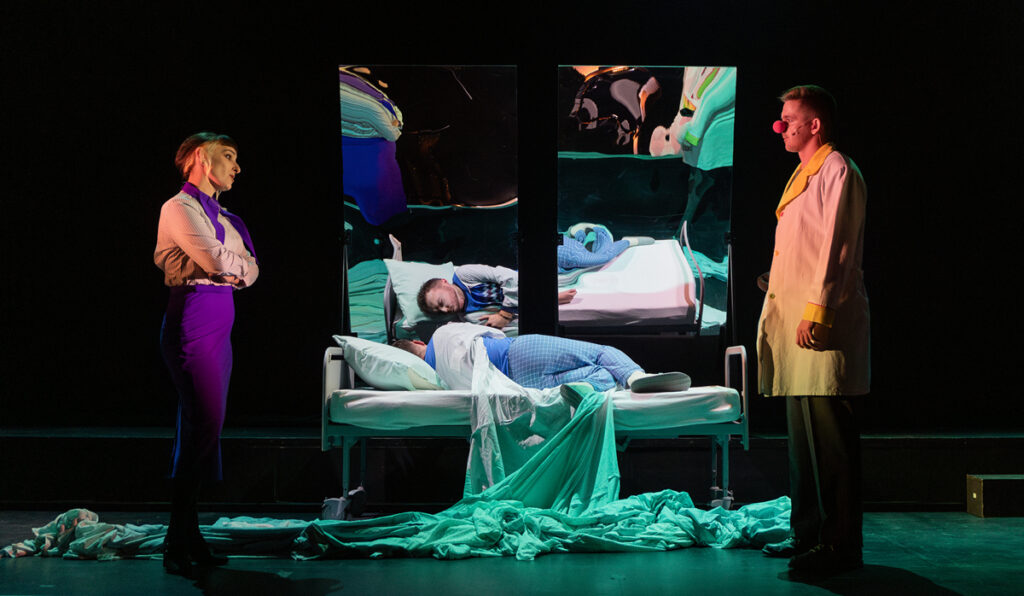 Začátek jednoaktovky byl poněkud napjatý, Narcis stál nehnutě dlouho na scéně, přilepený na zrcadle, už když přicházelo publikum. Po setmění hlediště se stále nic nedělo, ticho bylo v stále větší tenzi a na jevišti „rostla palma“. Náhle však přišel dirigent a představení se rozjelo. Záměr? Kouzlo nechtěného? Režisérem byl Martin Dostál pod pedagogickým vedením Aleny Vaňákové. Jen náznakovou scénu vytvořila Kristina Komárková, studentka Divadelní fakulty, a kostýmy jsou prací absolventky JAMU Magdaleny Černé. Centrální bodem je velké oboustranné zrcadlo, u kterého stojí dva Narcisové. Ten skutečný Miroslav Zdeněk Fiala (pedagog zpěvu Ivana Mikesková, herectví Magda Honzáková) je herecky tvárný, zpěv je prozatím nevyrovnaný, vyšší poloha zní průrazněji. Hudebně se s nelehkým partem vyrovnal bez problémů. Jeho Odrazem je Lukáš Fendrych, je to externista a je znát, že je na jevišti zkušenější. Jeho baryton je znělý a představitel pohybově a herecky suverénní. Echó je nesmělou, milou dívkou, kterou přesvědčivě představovala Petra Burgetová. Studentka zpěvu u pedagožky Ivany Zbránkové disponuje čistým a jasným sopránem, intonačně jistým. Pedagogem herectví byla Lubomíra Sonková, která vedla studentku k uvolněnému a přirozenému projevu. Dvě dívky Klaia a Nomia jsou dvě rozpustilá, toužící a lehkomyslná stvoření, osvěžující děj. Klaiu vytvořila Adriana Pružincová, pěvecké vedení Marta Chila Reichelová, a Nomiu Dorota Ryšánková, ta byla externí spoluprací. Hudba Kateřiny Slaběňákové, studentky pod vedením pedagoga Iva Medka, je průzračná a svěží, někdy rytmicky i intonačně náročná, ozývají se úseky s taneční hudbou. Orchestr pod vedením dirigenta Kenta Satsumy (pedagogické vedení Jakub Klecker) hrál spolehlivě a podporoval účinně pěvecké party.