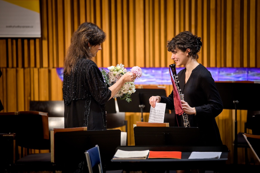 Mozartova třívětá koncertantní skladba, dílo osmnáctiletého mladíka, má občas rozverný charakter, obzvláště v pasážích, kdy se do doznívajících houslových duet vtírá hoboj a přidává se violoncello. Hobojistka Clara Dent-Bogányi měla překvapivě hojnou účast na sólovém dění, což bych přičítal výrazně mistrovskému vedení jejího partu. Poté, kdy se spodní melodie chopila violoncellistka Hana Baboráková, zaznělo okouzlující kvarteto. Clara Dent-Bogányi, skutečné zjevení koncertu, je salcburská rodačka a do koncertu v sále konzervatoře vnesla závan ducha mozartovského mládí. Studovala na Mozarteu v Salcburku a v Mnichově, hostuje jako sólistka u takových famózních orchestrů, jako jsou Bavorský rozhlasový a operní orchestr, Berlínští filharmonikové a další evropské orchestry. Je profesorkou hry na hoboj na Vysoké hudební škole v Norimberku.