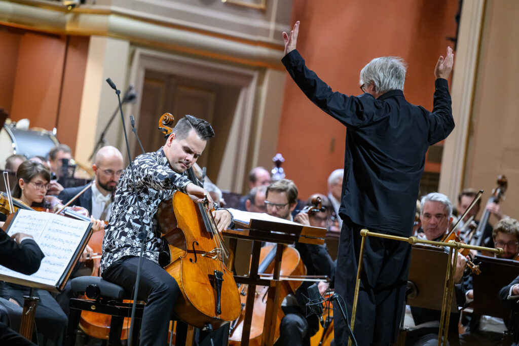 Sólista večera, violoncellista Václav Petr (rozhovor čtěte ZDE.) zaujal publikum hned při svém příchodu na pódium nejen výraznou extravagantní košilí s geometrickými černobílými objekty, ale co je důležitější, také od začátku koncentrovaným a precizním výkonem. Zhruba třicetiminutová skladba je koncipovaná jako jednovětá, nicméně v sobě skrývá pět autonomních částí. Z nich spolu myšlenkově korespondují první a pátá část, čímž v rámci celku autor vytváří velký „loop“ či smyčku. Smyčky Wajsar vytváří také ve vnitřních plochách skladby, a to jak v rytmických – zde bych vyzdvihl především suverénní výkon bicistky Anežky Novákové, členky orchestrální akademie, která hrála s Českou filharmonií svůj vůbec první projekt! –, tak v plochách témbrových a atmosférických, kde mohl svůj cit pro práci s barvami a zvuky ukázat publiku sólista Václav Petr. Zejména plocha využívající flažolety působila jako z „jiného světa“ a díky přirozeným mikrointervalům evokovala snad až starou antickou hudbu.