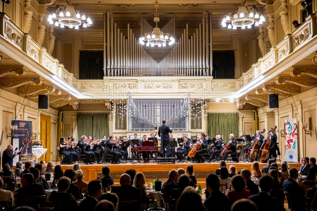 U vchodu do Besedního domu vítal klavírním recitálkem Jan Bráblík, který pak celý koncert provázel slovem v šarmantním obleku s vínově červeným motýlkem i doplňky. Sálem se mihli spoluorganizátoři, i Jiří Kokmotos. Po úvodních slovech Jana Bráblíka, Víta Němečka a Dagmar Fialové zastupující sommeliérku, bylo naléváno jemně perlivé do ručně vyrobených skleniček ze sklárny Květná.