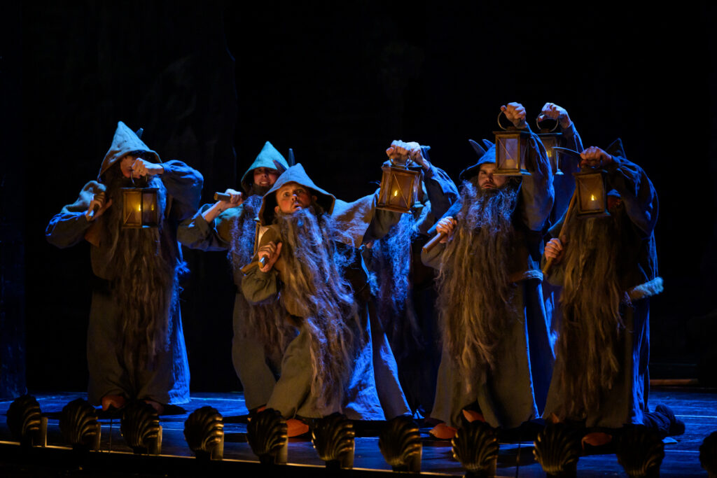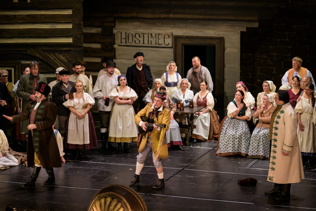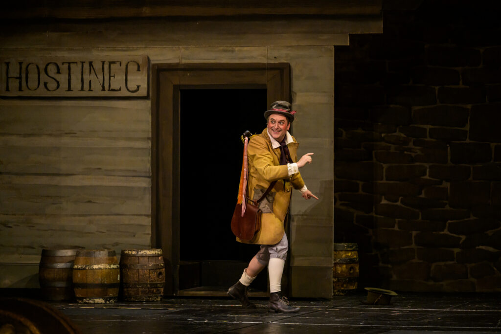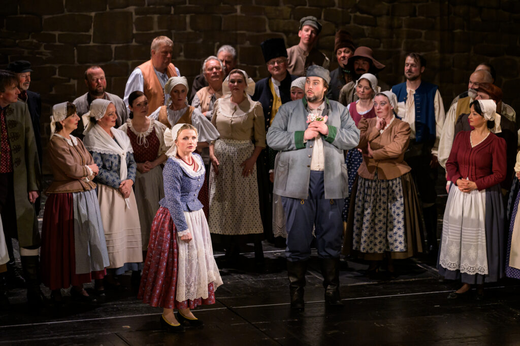 Na prvom mieste treba povedať, že to bol, aj podľa slov režiséra Havelky, zámer. Režisér inscenuje akúsi paródiu na divadlo 19. storočia, a ako vraví, ponecháva dielu naivitu, stavia sa k nej však s nadhľadom, robí si z nej v podstate žarty. Legitímny pohľad. Navyše, tento svoj zámer popisuje aj v bulletine a pre divákov sa tak, verím, stáva čitateľnejším. Vraciame sa do sveta okázalých gest, tradičných kostýmov (Barbora Maleninská), lepenkových kulís (scéna Martin Černý). Ako to už pri Tajemství býva, na horizonte nechýba ani samotný Bezděz, ktorého podoba celkom pripomína to, čo vidíme na záznamoch zo starších (a ešte starších) inscenácií. Tento pritom obsahuje aj pomerne veľa priamočiareho humoru. Dielčích gagov medzi protagonistami je neúrekom, neraz si vyžadujú celkom presné načasovanie: pre ilustráciu, keď Bonifác nájde list frátra Barnabáša, Kalinu mu promptne zloží okuliare a nasadí ich sám sebe, aby list prečítal len on. Trochu viac prvoplánovo potom pôsobia momenty ako ten, keď Blaženka po duete s Vítom nadšene odhadzuje z hlavy vienok. Ešte o čosi naivnejší humor vidíme o chvíľu na to, keď okolo dvojice prechádza procesia k Panne Márii a spôsobne oblečené dievčatá sa pri pohľade na milencov nielen prežehnávajú, ale aj omdlievajú. Inde je potom takýto prístup evidentnou a tým aj relatívne funkčnou hyperbolou – napríklad, keď na Bonifáca extrémne spomalene padá trám. Vlastne by som, napriek všetkým znakom, neoznačila túto réžiu sa skutočne tradičnú. Skôr ako hru, dokonca možno ironickú hru, na takéto uchopenie. Len si možno trochu vravím, že tento prístup Smetanu trochu vracia do limitujúcej pozície autora prostonárodných opier.