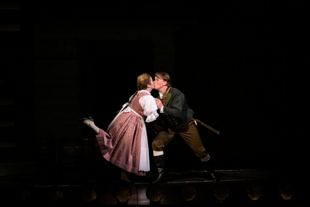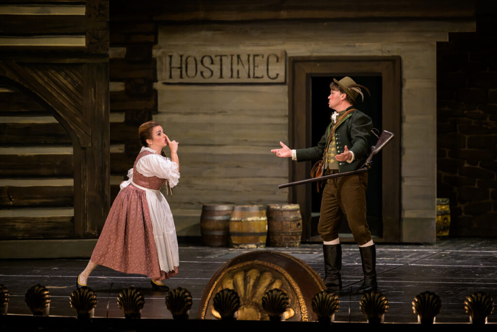 Myslím, že hlavne hromadné dedinské scény v tomto šate obstoja dobre, takisto sa hodí napríklad až k trochu karikovanej postave Bonifáca (to výstižne pojal Jan Martiník). Postavu Kaliny a takisto Rózy viedol režisér trochu mimo zveličení. Práve tieto role tak vyzneli o niečo civilnejšie, vzhľadom k ich príbehu som to ocenila. Navyše, Kalinu stvárnil na prvej premiére Adam Plachetka, ktorý so svojim povestným herectvom a prirodzenou komikou nemal problém celú rolu (a nielen tú) utiahnuť. Veľmi málo ale podľa mňa v tomto uchopení vyznel vzťah Víta a Blaženky. Ich predstavitelia Aleš Briscein a Jana Sibera síce zvládli všetko „správne“, nepôsobili ani, že by im táto divadelná bola neprirodzená. Tej spomínanej naivity tu ale na mňa bolo už príliš (u Blaženky duplom). Áno, je to v podstate romantická komédia a napriek pripodobneniam Tajemství k Rómeovi a Júlii by som tu naozaj žiadne príliš vznešené stvárnenie citov nečakala. Čistá, hoci možno, minimálne oproti Kalinovi s Rózou, stále trochu det(in)ská láska sa ale na javisku vlastne neodohráva. Je len naznačovaná v cielene schematických gestách, často prvoplánovo dvojzmyselných. Čaro duetu z druhého dejstva to podľa mňa dosť oslabilo.