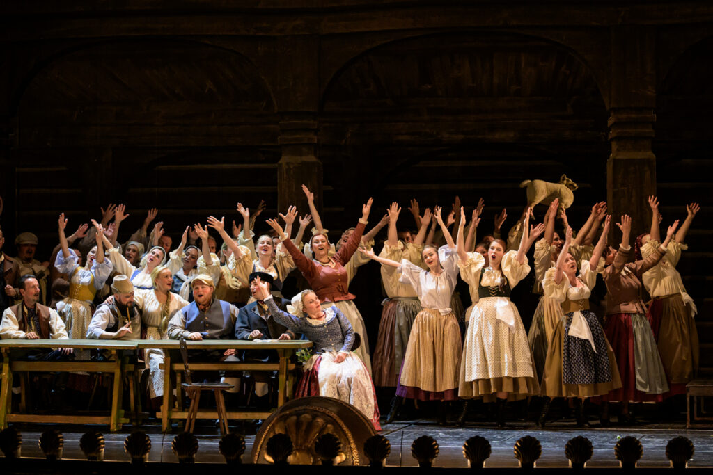 Ako som naznačila, kontrast hudby a námetu je v Tajemství celkom viditeľný. Havelka a dirigent Robert Jindra sa tento rozpor vlastne zmierniť nepokúšali. Jindra je pre mňa dirigentom, ktorý Orchestr Národního divadla dokáže inšpirovať, viesť ich k pomerne precíznej práci, k pestrejším výrazovým odtieňom. Do realizácie partitúry sa to premietlo aj tentokrát, možno však nie stopercentne. Orchestru pristali hlavne melodické miesta so širšími frázami (napríklad vo Vítovom „Z tvých sladkých úst“ alebo aj pri „Což ta voda výše stráni“), nechýbala im lyrika, dokázali sa stíšiť, rešpektovať priestor spevákov. Jindra tak našiel v partitúre viac romantiky, než sme videli na pódiu. Nesmeroval ani k mohutnosti, ktorá sa do interpretácií dostáva pomerne často – niekde to bolo veľmi príjemné, inde mi väčšia plnosť chýbala. Miestami som mala tiež dojem, že volil trochu miernejšie tempá, už možno v Allegro vivo v predohre. Rezervy tak mala interpretácia podľa mňa práve v miestach, ktoré by si vyžadovali hutnejší zvuk, prípadne tiež rýchlejšie, ostrejšie kontrasty (napríklad v Kalinovej árii). Dobre znela dychová sekcia (ako drevené, tak plechové nástroje), možno len na konci sme u nich viac počuli intonačné neistoty. Práve od drevených dychových nástrojov často zaznievali pekné melodické miesta. V kvalite sme počuli tiež väčšie sólové vstupy – lesný roh, flauta, violončelo. Celkovo som mala z orchestru pocit, že od generálky dospel k väčšej istote, možno teda progres očakávať ešte aj naďalej. Kompaktnejšie, než obvykle, na mňa pôsobil Sbor Opery Národního divadla – a to hlavne v scénach, kde spieval celý zbor spoločne.