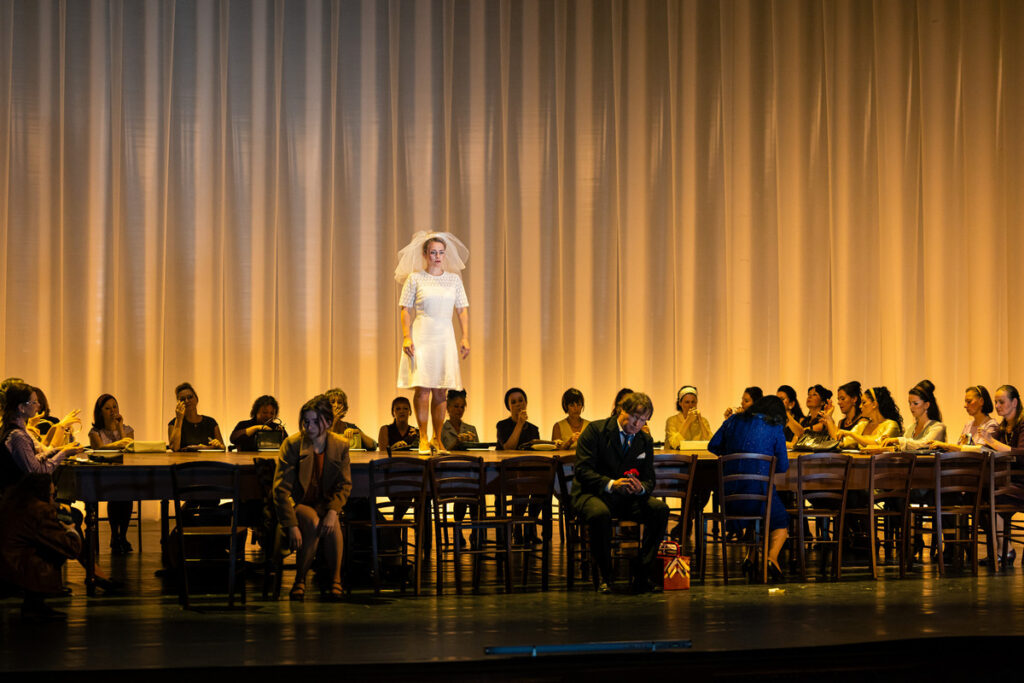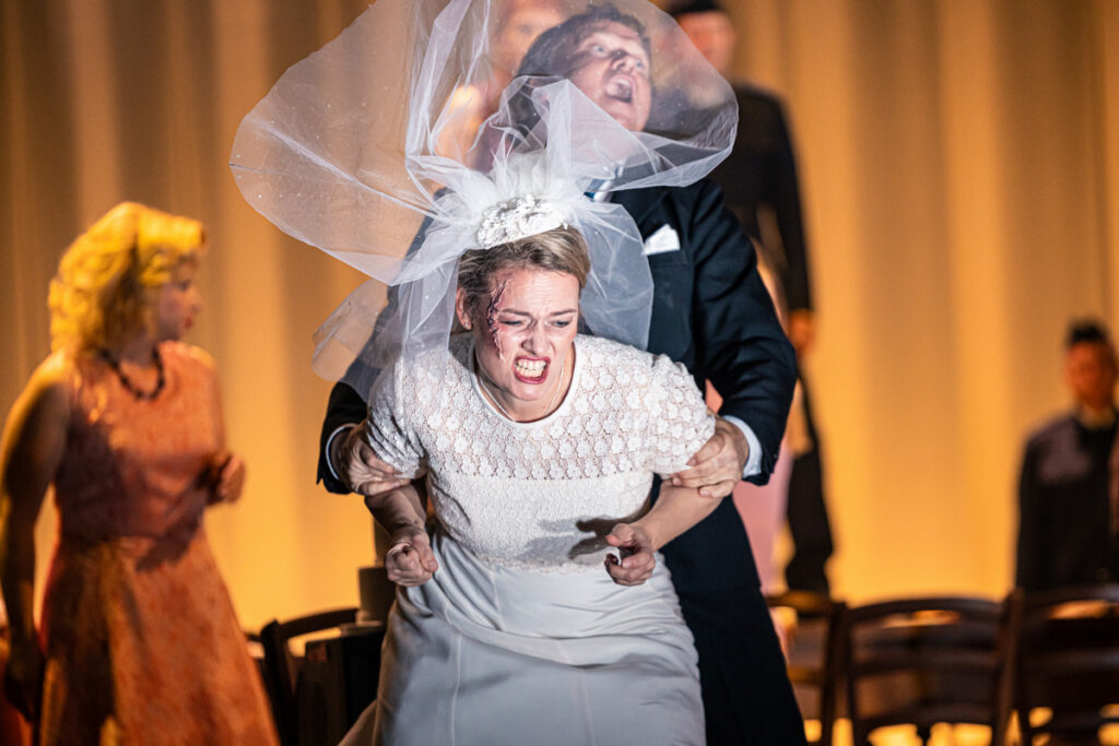 „Laca a Jenůfa sedí u stolu, křečovitě se smějí a mažou si vzájemně po tvářích kusy svatebního dortu.“