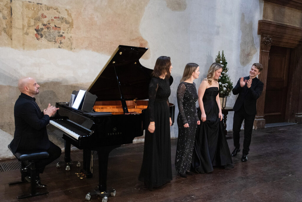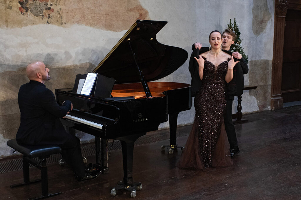 Vystúpenie konzervatoristiek na tomto koncerte vzišlo z kurzov z Mariuszem Kwiecieńom, ktoré prebehli na jeseň tohoto roku. Ten bol takisto pod záštitou Spolku přátel hudebních talentů. Účasť na kurzoch sa tak pre tri speváčky pretavila do skvelej príležitosti, ktorú všetky veľmi dobre využili. Predstavili sa vždy sólovo v jednej vianočnej skladbe, potom ako ansámbel spolu s hlavnými protagonistami večera. Anna Holeňová z Konzervatoře Pardubice spievala ako prvá, Pastorellu od Josefa Solnaře. Predviedla veľmi kultivovaný, prirodzený výkon s peknou dikciou. Ako druhú sme počuli Sáru Hejlovú z Konzervatořa Jana Deyla v Brahmsovej uspávanke. Uplatnila svoju trochu tmavšiu farbu a smerovala k trochu opernému výrazu a prejavu. V Gomezovej Ave Marii potom presvedčila Johana Klimová, takisto z „deyláku“. Skladba dala vyznieť jej pomerne sýtemu hlasu, takisto v nej mala priestor pre pozoruhodne suverénne výšky. Ako ansámbel potom študentky spievali v známych kusoch Mille cherubini Franza Schuberta, v Bachovej / Gounodovej Ave Marii a nakoniec v Panis angelicus. V Schubertovi možno bolo v nástupoch počuť trochu intonačnej neistoty, inak však bolo trio dostatočne kompaktné. Veľmi príjemne potom pôsobil prejav Petra Nekoranca, ktorý sa evidentne úprimne zaujímal o to, aby sa speváčky na pódiu cítili dobre. Vianočná tak nebola len dramaturgia, ale aj atmosféra, ktorá záveru koncertu vládla: prajná, priateľská a navyše napĺňajúca chvályhodnú myšlienku podpory talentu.