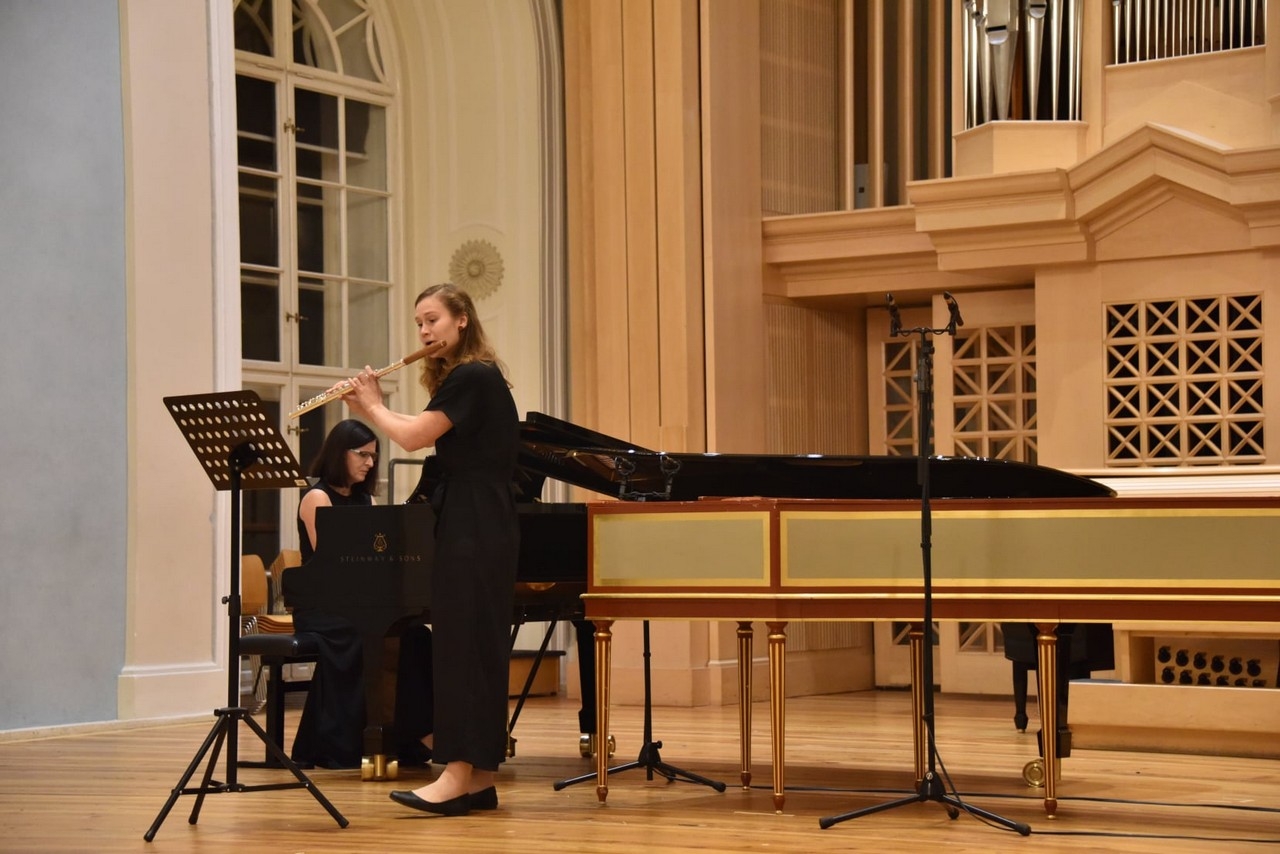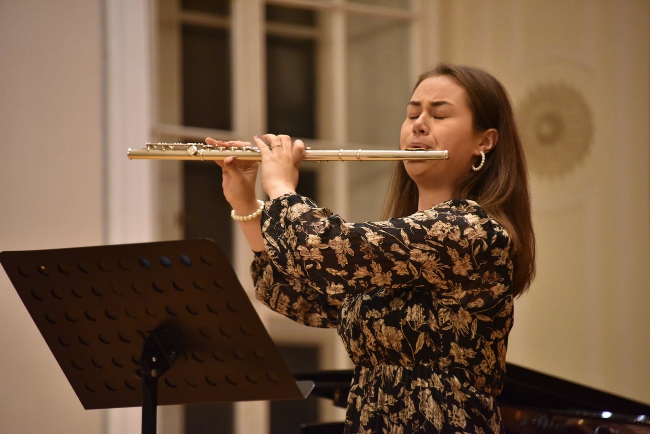 Eliška Hejhalová (s klavírní spoluprací Halky Klánské), studentka JAMU (loni ještě studentka AMU), obor flétna, oceněná v soutěži NBM 2020 druhou cenou v kategorii dechové nástroje, si pro koncert laureátů vybrala Sonátu pro flétnu a klavír, H 306 Bohuslava Martinů. Autor ji složil v roce 1945 během amerického pobytu, když s manželkou trávili léto u moře na poloostrově Cape Cod. Premiéra se uskutečnila v roce 1949 v New Yorku. Eliška Hejhalová vyjádřila veškerou prosluněnost a hravost díla. Již počátek první věty zazněl lehce, sebevědomě, hra byla velmi plynulá, synkopy rytmicky zajímavé a přesné. Projevila smysl pro tektoniku – z křehkého začátku dospěla k výrazné akcentaci. V druhé větě – Adagiu – naplno vyzněl její krásný tón, který se lámal od vysokých tónů do zklidnění hlubších, temnějších tónů. Vystupňovaná naléhavost se v závěru věty opět sklonila do působivého ticha. Ve třetí větě jsme slyšeli obdivuhodný soulad flétny a klavíru, technicky jisté trylkování i ostré „výkřiky“ flétny, interpretka předvedla širokou škálu tónů v nádherné melodické lince.