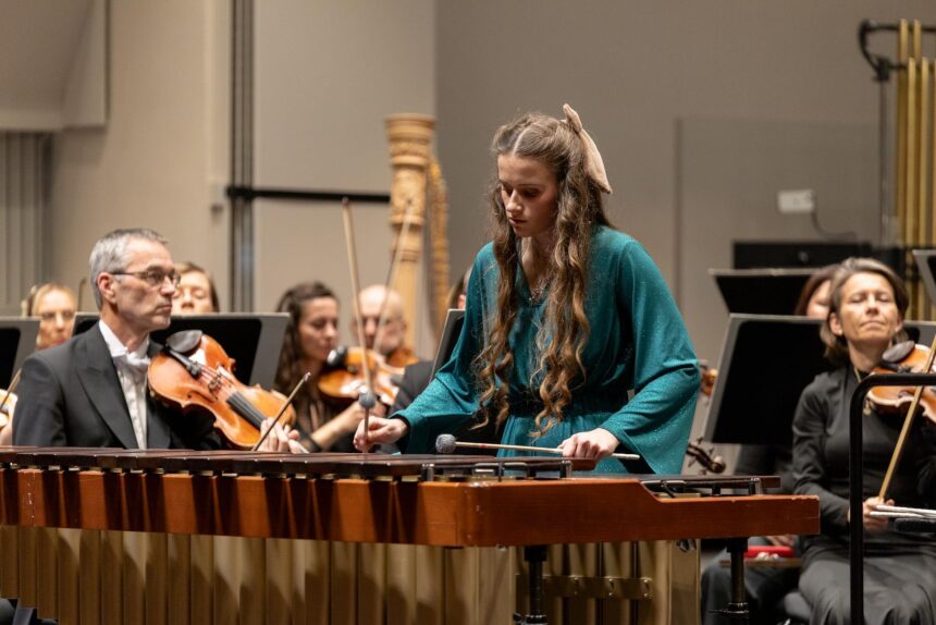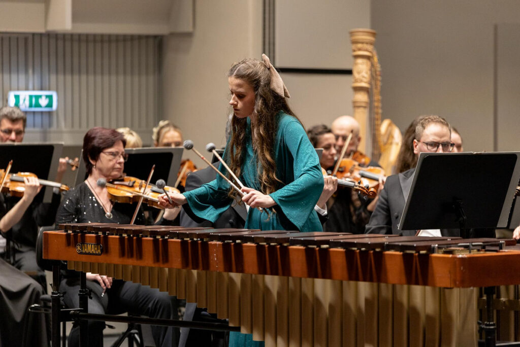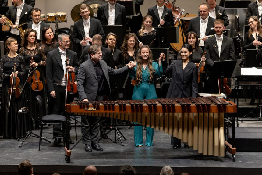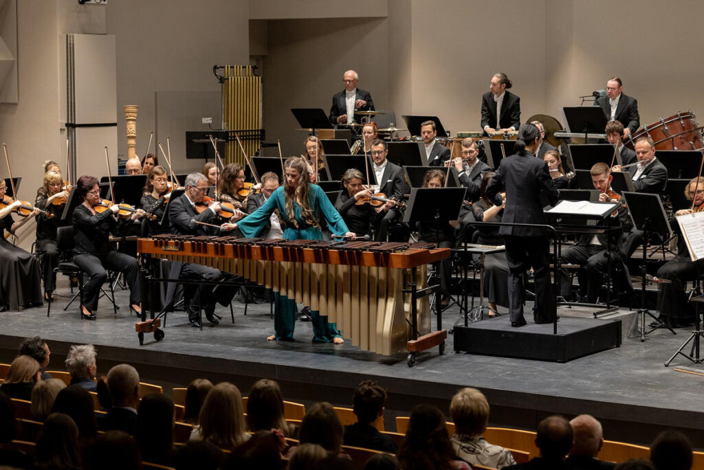 Přechod ke Koncertu pro marimbu a orchestr Kevina Beaverse byl osvěžujícím prvkem večera. Lenka Titzová na pódium přinesla esenci hravosti a spontaneity, což podtrhovaly i zvukové možnosti marimby, nástroje, který byl dříve vnímán jako doprovodný, zde však vystoupil do popředí jako plnohodnotný sólový hlas. Beaversova kompozice je pulsující, rytmicky vrstevnatá a místy i lyrická. Autor sám řekl: „Považuji marimbu za nástroj, který má blízko ke svým primitivním předkům. V jejím zvuku si snadno představím syrovou hudbu, která vzniká údery dřeva, kamene a natažených kůží. K marimbě jsem přistupoval jako k bubnu, kolem kterého létají paličky, interpret tančí a pomocí dramatického pohybu vyluzuje tóny.“ A Lenka Titzová opravdu tančila! Nejen celková interpretace a výraz, ale i její bosá chodidla vyjadřovala svobodu, nespoutanost a zemitost, se kterou dokázala interpretovat skladbu s naprosto přirozenou muzikalitou, technicky precizně a s velkým výrazovým nasazením. Silné momenty přicházely i ve chvílích, kdy sólistka zrovna nehrála a s posvátným soustředěním sledovala dění v orchestru, což působilo chvílemi až obřadně. Marimba zde díky ní nebyla jen perkusivním nástrojem, byla hlasem, který komunikoval, vyprávěl, rozvíjel dialog a symbolizoval schopnost ženského hudebního projevu překračovat konvence.