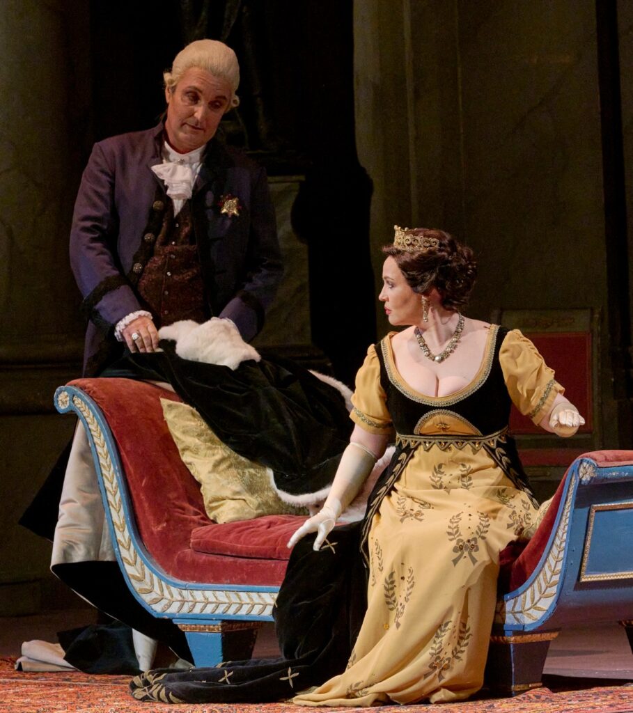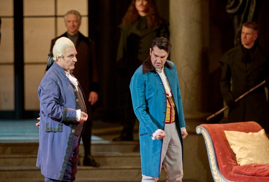 Zdálo by se, že po 67 letech, kdy se Tosca Margarete Wallmann hraje představení co představení před plným sálem, už tuto inscenaci nic vysloveně neočekávaného potkat nemůže. Jenže stalo se, a to právě během zmíněného večera 25. září 2025. První dějství, odehrávající se v chrámu Sant’Andrea della Valle, ještě proběhlo zcela bez problémů. Pucciniovský specialista Jonathan Tetelman rozpálil auditorium hned svou vstupní Cavaradossiho tenorovou arií Recondita armonia, aby následně spolu se zkušenou sopranistkou Elenou Stikhinou v roli Tosky pečlivě vymodeloval nejprve žárlivý a posléze láskyplný duet obou milenců. Ludovic Tézier v úloze Scarpii (s Tetelmanem jedna z hvězd letos vydané nahrávky Tosky z produkce Deutsche Grammophon) poté opanoval zbytek aktu svým technicky bezvadně ovládaným barytonem i hereckým pojetím, v němž se snoubila elegance racionálně působícího policejního úředníka s neovladatelnými vnitřními běsy, s nimiž tato postava sváděla nerovný zápas. Závěrečné Te Deum, v němž Scarpia do probíhajícího církevního obřadu šeptá svá chlípná přání a dává Tosce za vinu, že se „kvůli ní zřekl Boha“, tvořilo opravdu sugestivní finále.