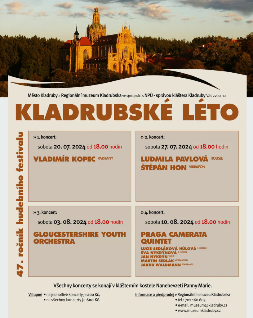 V Kladrubech u Plzně připravují 47. ročník hudebního festivalu v klášterním kostele Nanebevzetí Panny Marie. Čtveřice koncertů nabízí pestrost nástrojového obsazení, sahající od sól až k orchestru mladých z britského hrabství Gloucestershire. První, varhanní koncert se koná 20. července od osmnácti hodin v interpretačním pojetí Vladimíra Kopce.