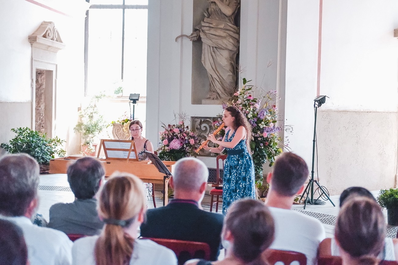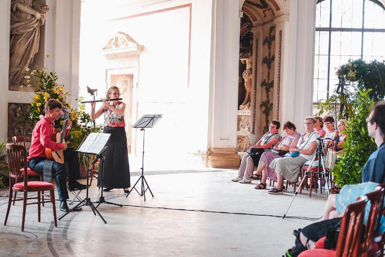 Také sobotní den probíhal ve znamení vyprávění z řecké mytologie a loutkových představení. Nedílnou součástí programu festivalu byla také Floristická show a Květinový workshop v nádherném prostředí Květné zahrady, která poskytovala útěšný stín a příležitosti k osvěžení u barokních kašen. Odpolední koncert ovládla půvabná dvojice dam Michaela Koudelková (flétna) a Monika Knoblochová (cembalo). V jejich podání posluchači vyslechli transkripce i originální skladby německých a italských mistrů vrcholného baroka. Strhující virtuozita Michaely Koudelkové na sebe nenechala dlouho čekat. Není u nás mnoho umělců, kteří dokáží něco podobného s takovou samozřejmostí, nadhledem a precizností. Můj obdiv k této skvělé flétnistce, která během koncertu představila několik typů barokních fléten, ještě vzrostl, když jsem zjistil, že si o den dřív zlomila nohu, a přesto koncert bez mrknutí oka odehrála vestoje. Duo Koudelková-Knoblochová disponovalo skvělou souhrou a stylově bezvadnou interpretací, která může být označena jako vzorová.