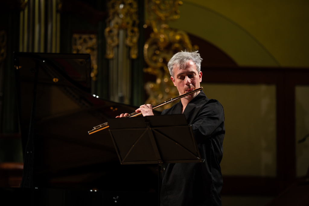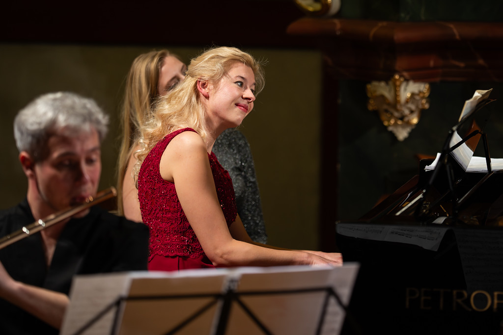 Oto Reiprich je prvním flétnistou orchestru Prague Philharmonia, Kristina Vocetková a Johanna Haniková se v rámci komorního cyklu představily úplně poprvé. Své společné vystoupení uvedli Klavírním triem g moll op. 17 od Clary Schumannové, houslového partu této čtyřvěté kompozice se ujala flétna. První věta Allegro moderato nás jemně, ale pevně vtáhla do hudebního dění svým vnitřním pohybem, interpreti se nebáli hudbu hrát hutně a romanticky, což estetiku německé hudby 19. století velmi dobře vystihovalo. Trio uplatňovalo rubata a diferencovali zvukovou barvu, klavíristka Johanna Haniková se nebála hrát melodické linky skutečně espressivo, díky čemuž klavírní tón zářil víc, než bychom možná očekávali. V žádném případě si ale nebrala pro sebe více zvukového prostoru, než jejímu partu náleželo, zvukové poměry mezi jednotlivými hráči byly dobře a zajímavě vyvážené. Johanna Haniková pracovala s dynamikou i v rámci svého vlastního partu, občas zvýraznila diskant, jindy zněla výrazněji melodie v hlubších polohách nástroje, což dodávalo zvuku potřebnou plasticitu.