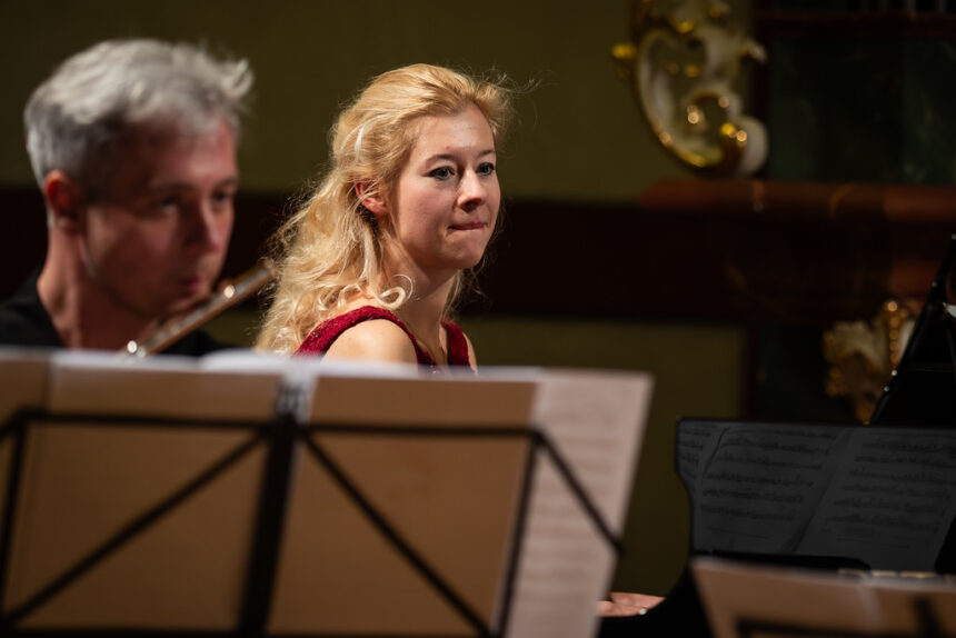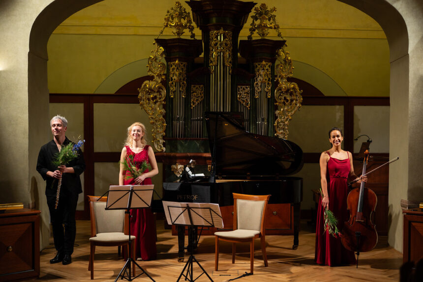 Oto Reiprich je prvním flétnistou orchestru Prague Philharmonia, Kristina Vocetková a Johanna Haniková se v rámci komorního cyklu představily úplně poprvé. Své společné vystoupení uvedli Klavírním triem g moll op. 17 od Clary Schumannové, houslového partu této čtyřvěté kompozice se ujala flétna. První věta Allegro moderato nás jemně, ale pevně vtáhla do hudebního dění svým vnitřním pohybem, interpreti se nebáli hudbu hrát hutně a romanticky, což estetiku německé hudby 19. století velmi dobře vystihovalo. Trio uplatňovalo rubata a diferencovali zvukovou barvu, klavíristka Johanna Haniková se nebála hrát melodické linky skutečně espressivo, díky čemuž klavírní tón zářil víc, než bychom možná očekávali. V žádném případě si ale nebrala pro sebe více zvukového prostoru, než jejímu partu náleželo, zvukové poměry mezi jednotlivými hráči byly dobře a zajímavě vyvážené. Johanna Haniková pracovala s dynamikou i v rámci svého vlastního partu, občas zvýraznila diskant, jindy zněla výrazněji melodie v hlubších polohách nástroje, což dodávalo zvuku potřebnou plasticitu.