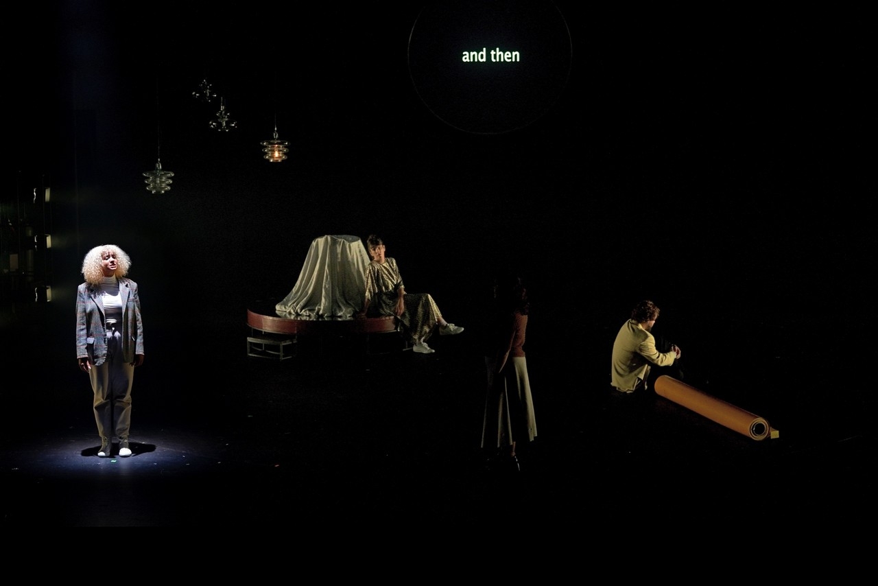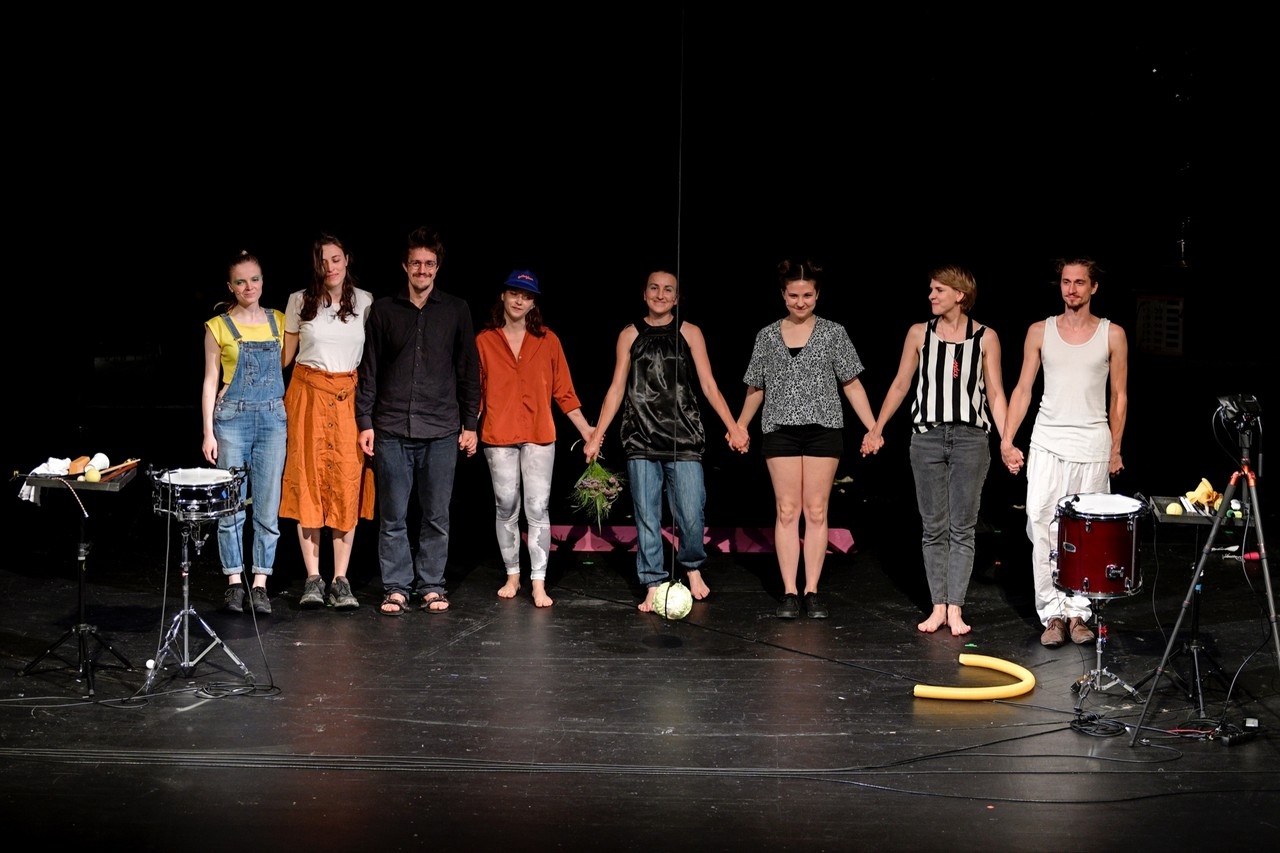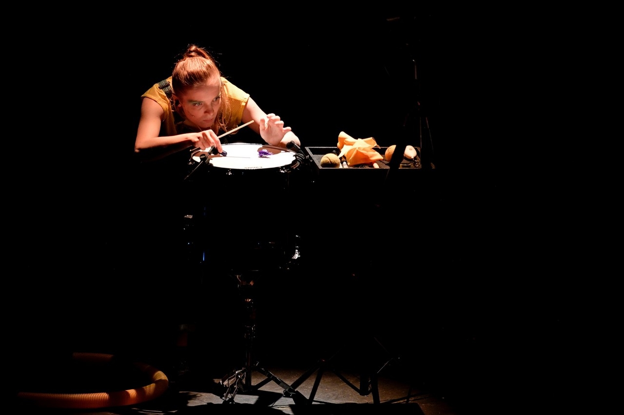Páchová svoje dielo umiestňuje na scénu (Jana Nunčič), ktorá je vlastne akýmsi priestorom na umiestnenie a využitie rekvizít, ktoré sa stávajú zdrojom zvuku. Je to zaujímavý koncept, občas som len trochu premýšľala, či scénická forma vlastne autorkinu invenciu nezväzovala. Vzhľadom k maximálne stlmeným svetlám pritom púta pozornosť najmä predmety, respektíve osoby, ktoré sú osvetlené (svetelný design a režijná spolupráca Jan Neugebauer). Vidíme napríklad svietiace rúry od vysávača, v popredí stoja bicie nástroje, ktoré sú často využívané „alternatívnym“ spôsobom: údery na hranu, škrabanie po blane… Dôležitými sa stávajú aj lopty rôznych veľkostí (pingpongové, fitness), ktoré vytvárajú rôzne druhy zvukov, a Páchová ich údermi zároveň vytvára určité rytmické štruktúry. Ako zdroje zvuku potom slúžia napríklad aj kostýmy – skladateľka pracuje napríklad so zvukom zipsu. Z opery sa tak stáva tak trochu zážitok v štýle ASMR (Autonómna senzorická meridiánová reakcia). V určitom momente mi pripomenul aj rubriku jedného slovenského rádia – tá sa volá zvuk týždňa a poslucháči hádajú, čo bolo zdrojom zvuku v nahrávke. Aj v opere Lucie Páchovej sú predmety zbavované ich bežného kontextu, stávajú sa proste pôvodcami zvukových podnetov. Spev sa v Páchovej opere dostáva k slovu až celkom ku koncu, a napriek nelineárnemu priebehu opery vytvára akési ťažisko. Hlasové prejavy interpretiek ale počuť behom celej opery. V bulletine Páchová vyzýva k tomu, aby poslucháč operu využil na skúmanie vlastného vnímania. Takto sa s týmto zážitkom celkom určite pracovať dá, môžeme skúmať, čo nás upúta, prečo nás to upúta, odkiaľ zvuk počujeme. Priznám sa ale, že mi premenlivosť podnetov už po určitej dobe nedovoľovala počúvať tak sústredene, ako, povedzme, prvých desať minút – tu však naozaj môže ísť o moje nastavenie.