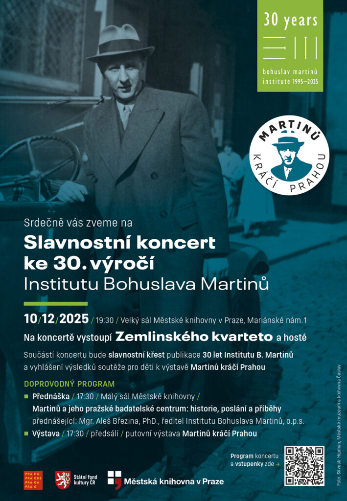 Institut Bohuslava Martinů v Praze letos slaví tři desetiletí své existence. Oslavy vyvrcholí 10. prosince akcí, která propojí hudební, vzdělávací a výstavní aktivity a připomene zásadní roli institutu v dokumentaci, bádání a popularizaci díla jednoho z nejvýznamnějších českých skladatelů dvacátého století. Uskuteční se na ústředí pražské Městské knihovny a jejími hudebními hosty budou Zemlinského kvarteto, Irvin Venyš a Igor Františák.
