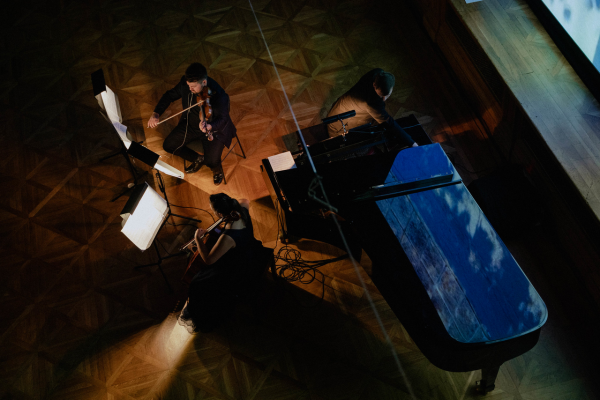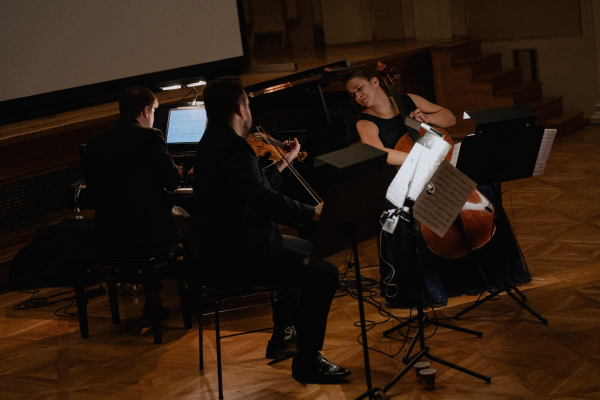 Komorní byl koncert i v obsazení sálu, což umožnilo zmenšení řad pro publikum, posazení Tria na úroveň obecenstva a za účinkující pověsit velké promítací plátno. V první skladbě nebylo plátno třeba, Moving Silhouettes českého klavíristy a skladatele Martina Brunnera (*1983) hráli hudebníci ve světové premiéře bez projekce. Skladba překvapila měkkostí a melancholickou melodičností, která se odvíjela bezděčně a zvukomalebně, nejprve v pomalé melodii, později se zvuk rozšířil v crescendu do hutnosti a naléhavosti, do dialogu houslí a violoncella zasahoval klavír perlivými, zvonivými tóny, zvuk vrcholil v expresivním výrazu, aby se postupně zklidnil. Plačtivé houslové sólo střídalo violoncello, až se spojili v emočním proudu hudby v slábnoucí dynamice. Zaujala emoční sdělnost hudby i krásné tóny houslí a violoncella, které se slévaly v barevné harmonii, citlivě doplněné klavírem.