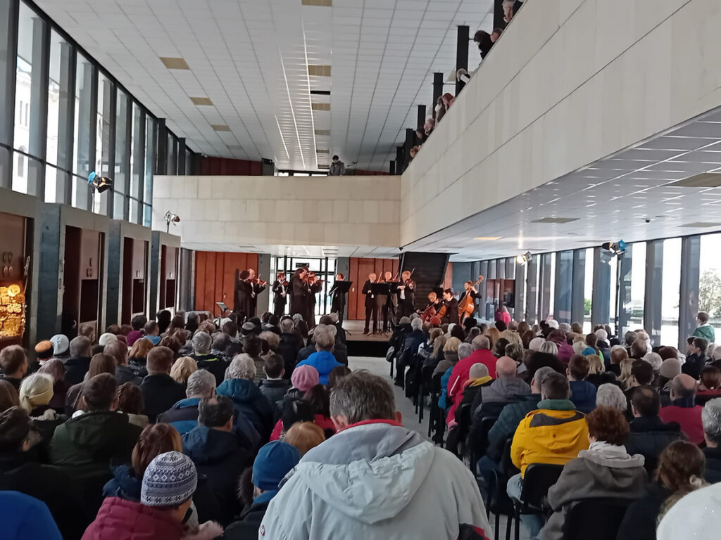 Mnoho času na vstřebávání silných dojmů nebylo, pokud jste chtěli stihnout aspoň rychlý oběd a mít dobré místo v prosklené železobetonové Vřídelní kolonádě pod kostelem sv. Máří Magdalény. V půl třetí odpoledne totiž prostor u pramenných váz s termominerální vodou spolu s kolegy rozezněla houslistka Irena Jakubcová, umělecká vedoucí Komorního orchestru složeného ze členů České filharmonie a Karlovarského symfonického orchestru. Vděční diváci naslouchali i z ochozu v prvním patře. Koncert propojil barokní hudbu Benátčana Tomasa Albinoniho a Čecha z Nelahozevsi, tedy Antonína Dvořáka, byť oba dělí téměř dvě století. Protože běžnou barokní praxí byla výměna nástrojů, sólový hobojový part zazněl v podání prvního trumpetisty České filharmonie Stanislava Masaryka. Mimochodem zkušená houslistka na postu prvního zástupce koncertního mistra České filharmonie Irena Jakubcová vzala smyčec do ruky již v pěti letech na „zušce“ právě v Karlových Varech. „Tento koncert měl bezprostřední atmosféru a kouzlo skoro jako open air koncert a muzikanty bavilo také spojení s kolegy z Karlovarského symfonického orchestru,“ těšil se z akce David Mareček, generální ředitel České filharmonie, podle kterého vystoupení ve Velkém sále Thermalu jen umocnilo spojení s MFF Karlovy Vary.