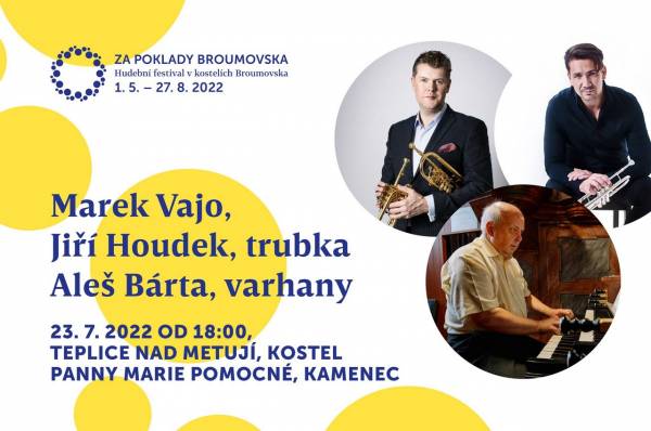 V sobotu 23. července od 18 hodin v Teplicích nad Metují – Kamenci, v kostele Panny Marie Pomocné zaznějí Schubertova Ave Maria, Bachův chorál Wachet auf, ruft uns die Stimme i virtuózní skladby pro trubku s doprovodem varhan. Pořadatelé pozvali předního domácího varhaníka Aleše Bártu a významné české trumpetisty Marka Vaja a Jiřího Houdka. Vstupné na koncert je dobrovolné, výtěžek putuje na obnovu kostelů broumovské skupiny.