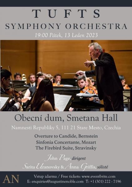 Americký Tufts Symphony Orchestra z univerzity v Medfordu ve státě Massachusetts s dirigentem Johnem Pagem navštíví během evropského turné také Prahu, a to v pátek 13. ledna. Ve Smetanově síni Obecního domu od 19 hodin budou na programu předehra k operetě Candide Leonarda Bernsteina, Koncertantní symfonie pro housle, violu a orchestr Wolfganga Amadea Mozarta a Suita z baletu Pták Ohnivák Igora Stravinského.