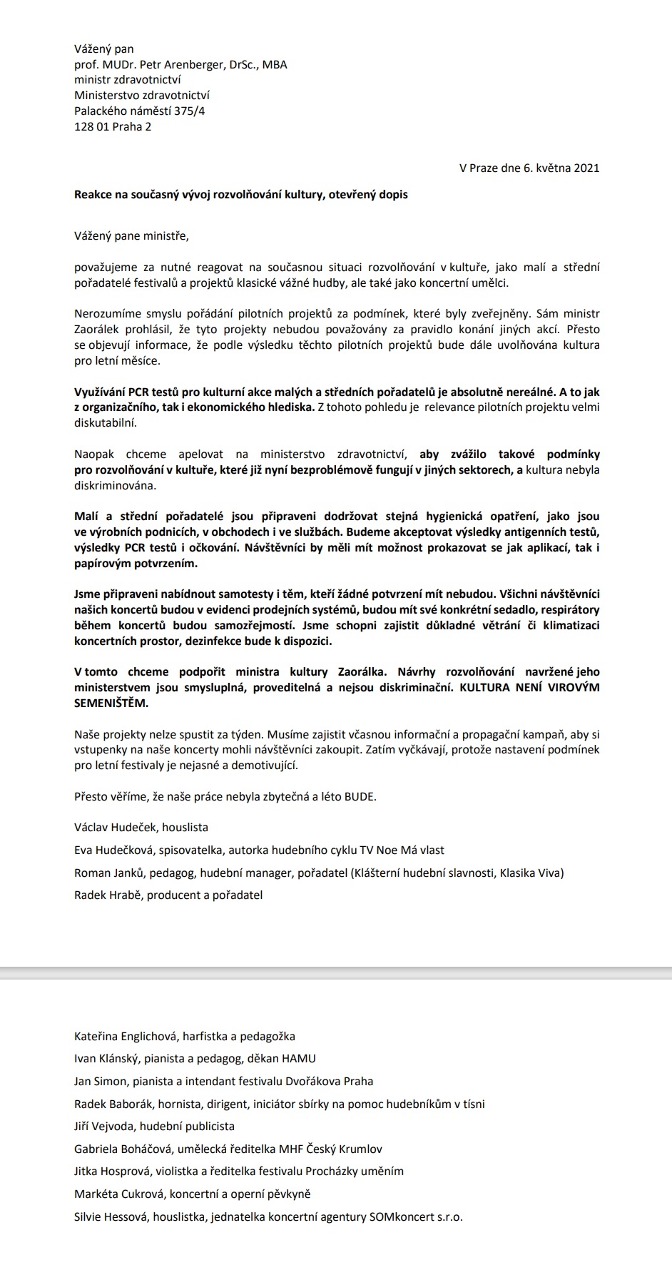 Přední umělci se obrátili otevřeným dopisem na ministra zdravotnictví Petra Arenbergera. Vyzývají ho, aby zvážil podmínky pro rozvolňování v kultuře. Poukazují na nereálnost využívání PCR testů a žádají podmínky, které už teď bezproblémově fungují v jiných sektorech, tak, aby kultura nebyla diskriminována. Také zdůrazňují, že kultura není virovým semeništěm. Dopis podepsali třeba houslista Václav Hudeček, pianista a pedagog AMU Ivan Klánský, hornista Radek Baborák, harfistka Kateřina Englichová, publicista Jiří Vejvoda, pěvkyně Markéta Cukrová, violistka Jitka Hosprová, intendant festivalu Dvořákova Praha Jan Simon, producent Radek Hrabě a další. Navazují tak na březnový dopis, který adresovali šéfovi resortu kultury Lubomíru Zaorálkovi, informovali jsme o něm ZDE.