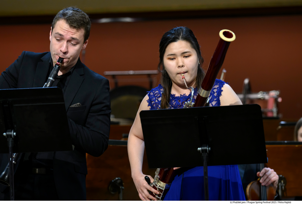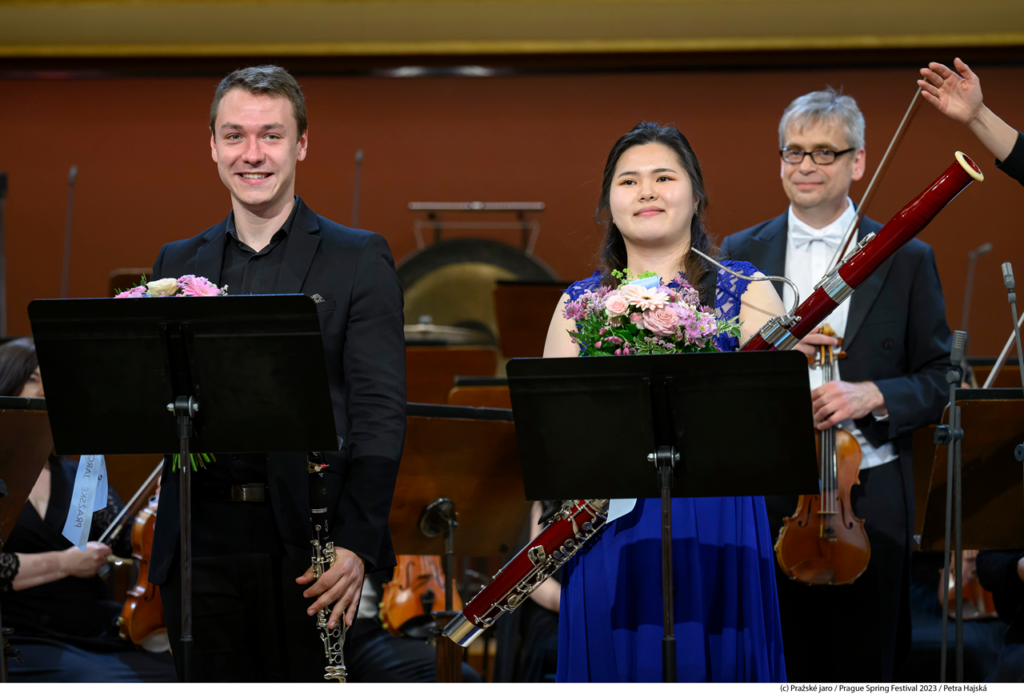 Bylo potěšením sledovat, jak dirigentka Oksana Lyniv ten rozeklaný monument bezpečně vede a usměrňuje jednoduchými, přehlednými gesty, bez zbytečné exaltace. V podstatě týž přístup – byť v distingovanější formě – zaujala při provedení Duetta-concertina pro klarinet, fagot, smyčcový orchestr a harfu Richarda Strausse. Sólové party byly svěřeny vítězům loňské Mezinárodní hudební soutěže Pražské jaro 2022 v dotyčných oborech, jimiž se stali klarinetista Lilian Lefebvre z Francie a fagotistka Minju Kim z Korejské republiky. Oproti Resatschově de facto kantátové výpovědi nastala diametrálně odlišná hudební atmosféra předznamenaná líbezným úvodem obou sólistů, jenž zároveň anticipoval mozartovskou druhou polovinu programu po přestávce. Straussovo obligátně třívěté concertino má své obsahové pozadí s různě tradovanými variantami a tradičními pohádkovými postavami – princeznou, pasáčkem vepřů, princem a medvědem, včetně polibku následovaného zázračnou proměnou. Také tato skladba zazněla v nepřetržitém sledu, myslím ku prospěchu kompaktnosti hudebního příběhu. Strauss, jenž tuto svou poslední instrumentální skladbu napsal pouhé dva roky před smrtí, se tu ukázal být skutečným mistrem instrumentačního umění nejen co do povahopisné charakteristiky obou sólových nástrojů, ale i drobnokresby kolektivní složky. Sólisté kromě technické stránky vynikli skvělým cítěním frází (toto hlavně klarinet) i sebemenších detailů jakož i vystižením subtilní komiky (toto zase spíše a logicky fagot). Bezpečně se orientovali v rostoucím propletení svých partů gradovaných nabývající virtuozitou. Kolektiv smyčců, účinně stimulovaný dirigentkou, se postaral o křehký a celistvý zvuk.