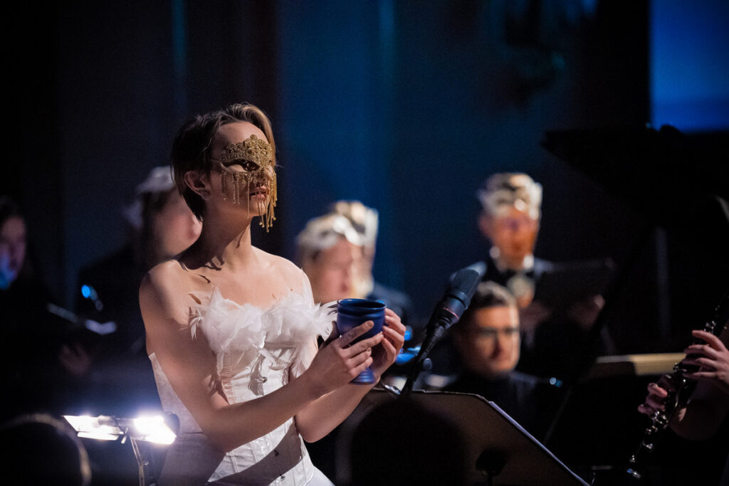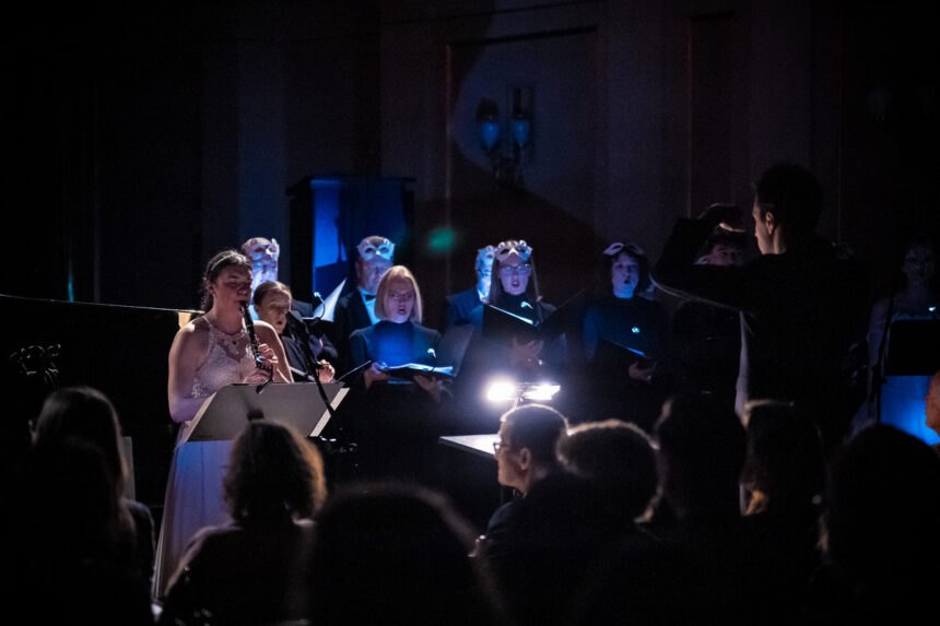 Nyní k samotné interpretaci tohoto mystického skvostu, který svou hudební podobou a svou hudební matérií připomínající s lehkou nadsázkou evropský duchovní minimalismus stvrdil plně mysteriózní charakter. Dominujícími účinkujícími se stali klavírista, sbor a vypravěč pod vedením dirigenta Adomase Morkūnas-Budryse. Klavírista proto, že jednoznačně tvořil celou páteř díla, z níž vše ostatní vzrůstalo. Miroslav Beinhauer navíc klavírnímu partu vtiskl potřebnou dramatičnost, která oscilovala mezi krajními polohami nástroje, konkrétně hlubokými dlouhými tóny v maximální měkkosti a opření a proti tomu drobnými vyhrávkami ve vysoké poloze s pocitem nebeské něžnosti. Klarinet zvukově vynikal trochu méně, často ho pohlcoval zvuk sboru, jenž byl vskutku obrovský. V několika částech se mu však podařilo proniknout, v ten moment skvostně doplňoval celé dílo svým mělkým témbrem a bylo evidentní, že i interpretačně v podání bezkonkurenční Anny Paulové zapadá skvěle do celého konceptu. Ze sólistů pak vynikal technickou stabilitou a jistotou a interpretační zainteresovaností zejména Kajus Rudžionis v roli vypravěče, který deklamací svých vstupů až neuvěřitelně přesvědčivě vstupoval do sborových pasáží. Tenorista Laurynas Viliušis zůstal v hudbě poměrně skryt, přesto tu a tam nápaditě vynikl, vlastně se jednalo o srovnatelný případ s klarinetem. To stejné platilo v případě basisty Domase Saulevičiuse. Zmiňovaná sopranistka náročný part s opakovanými tóny g dvoučárkované v části Poselství Gandharvů stěží zvládala, stejně tak i pasáže ve vyšší tessituře části Havraň a labuť. Chyběla jí především pevnost a ukotvení se v dechu, které by jí poskytly mimo jiné zvukovou rezervu, a koncentrace tónu na menším prostoru masky. Bez kvalitního sboru by však toto dílo nemělo smysl vůbec realizovat. V případě obsazení Komorního sboru Aidija šlo, jak se zdá, o sázku na jistotu. Od nasazení prvního tónu zpěváci pohltili posluchače kompaktním zvukovým fondem a slyšitelným odhodláním performovat tento pozoruhodný námět skladby. Harmonicky napjaté pasáže zvládali s jistotou a evidentní byla jejich pilná příprava. Ačkoli skladba působila minimalisticky a mnohé části se opakovaly, troufám si říci, že na straně příjemce takový dojem vůbec nevznikal, hudební proud plynul, zvuk se transformoval a myšlenky obsažené v libretu plně zaměstnávaly mysl diváků, kteří zřejmě toužili po jediném – po pokračování, které by nastolilo odpovědi, v daném tématu nemožné naleznout.